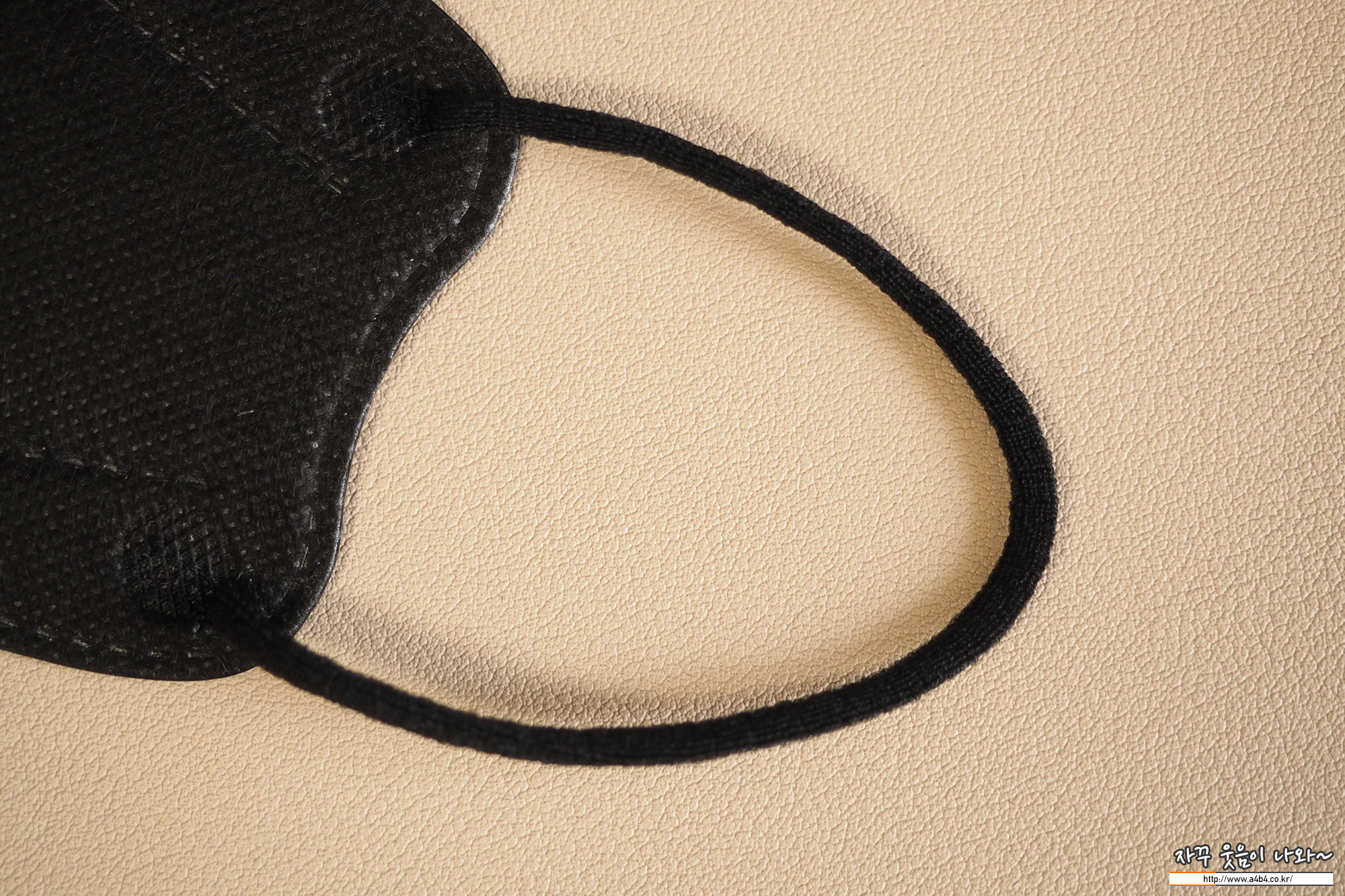 둥근모양의 귀걸이끈이 KF94 매일편한 황사방역용 마스크 전면에 부착되어 있습니다. 접착 상태는 양호하며 귀걸이끈 탄성은 보통수준을 보여줍니다.