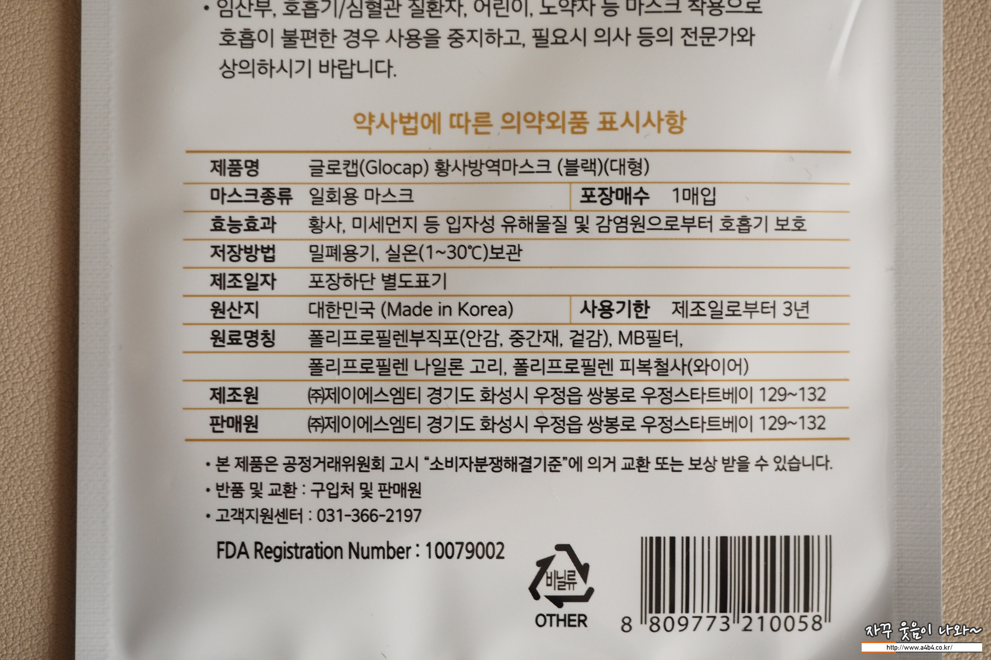 식약처 의약품안전나라 등록 제품명은 '글로캡황사방역용입체마스크'입니다. Kf94 보건용마스크로 마스크 색상은 흰색과 검정색이 등록되어 있습니다. 21년 9월 허가된 마스크로 마스크 제조 및 판매는 '(주)제이에스엠티'입니다. Glocap 네임으로 여러 타입이 제품을 판매하고 있네요.