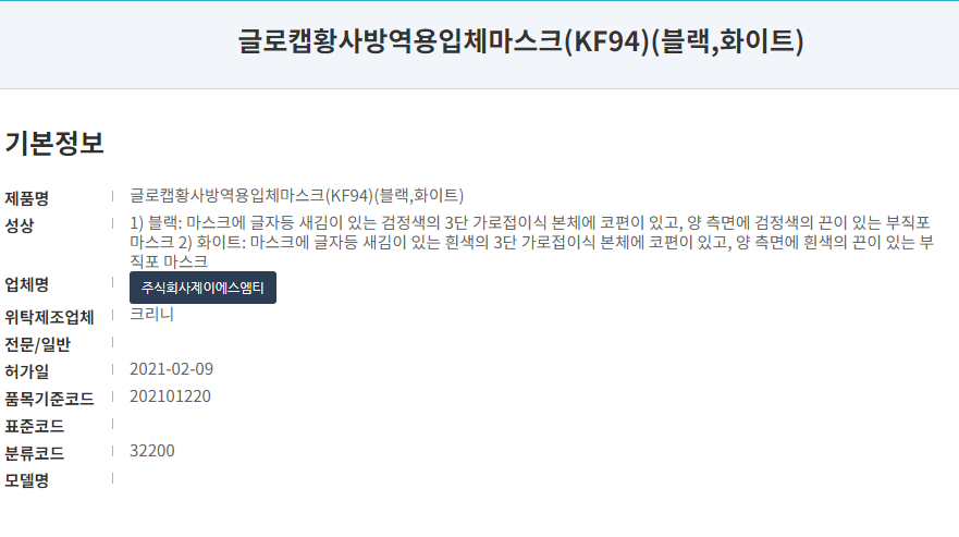 해당제품에 대한 식약처 등록정보는 아래와 같으며, 불량마스크로 등록된 이력은 없습니다.