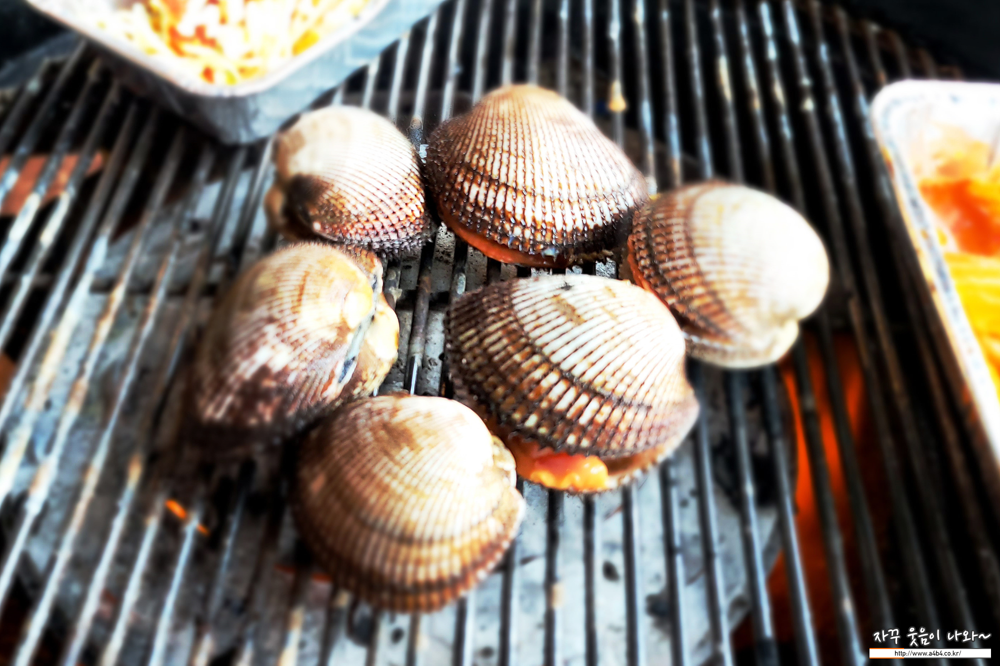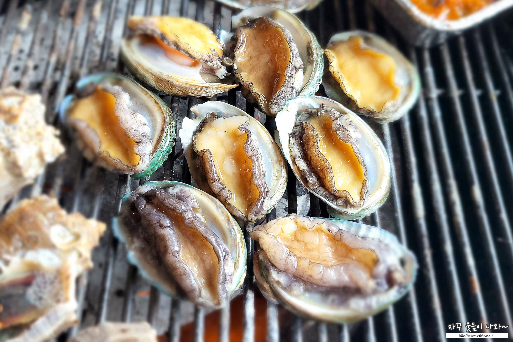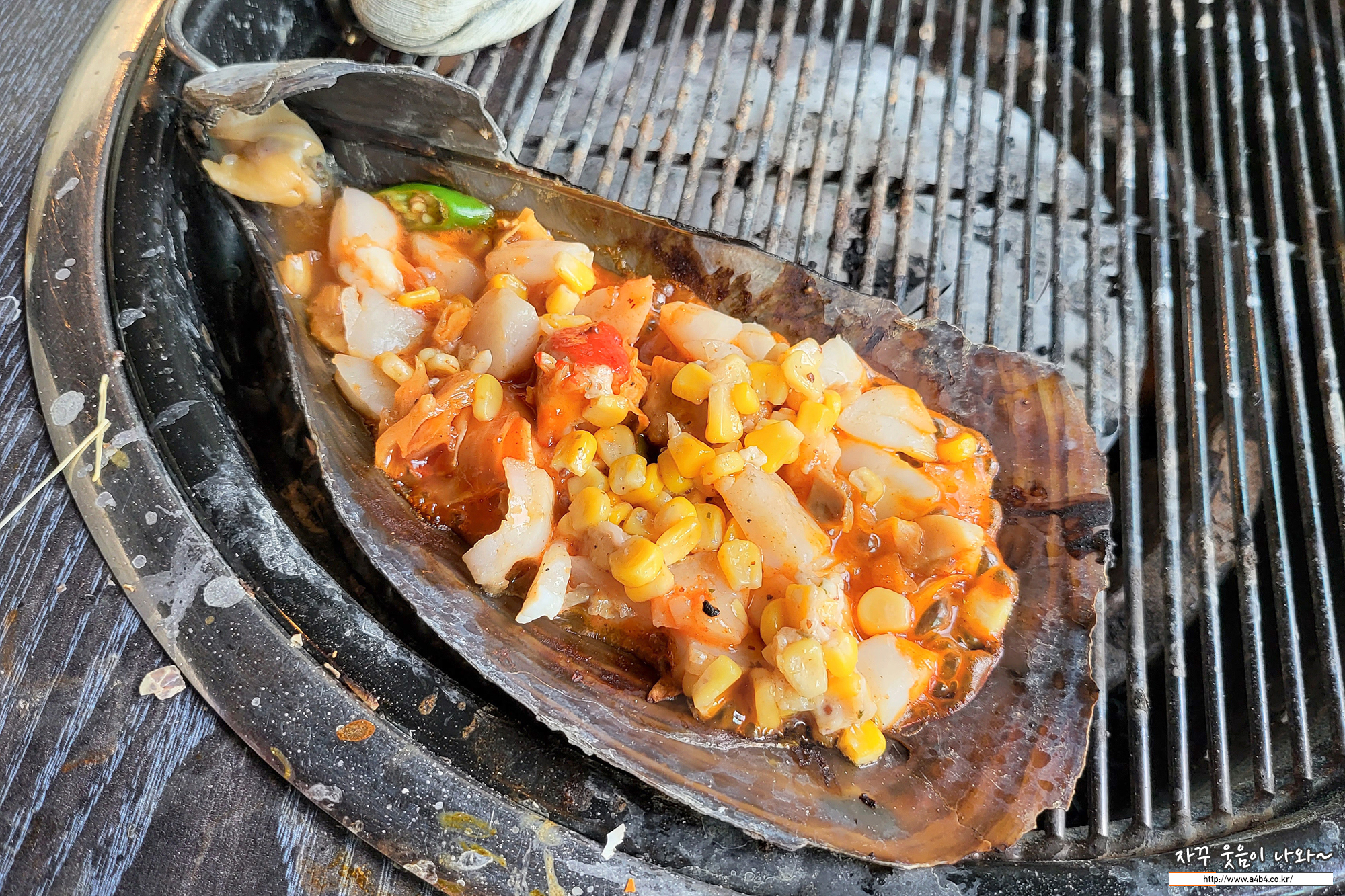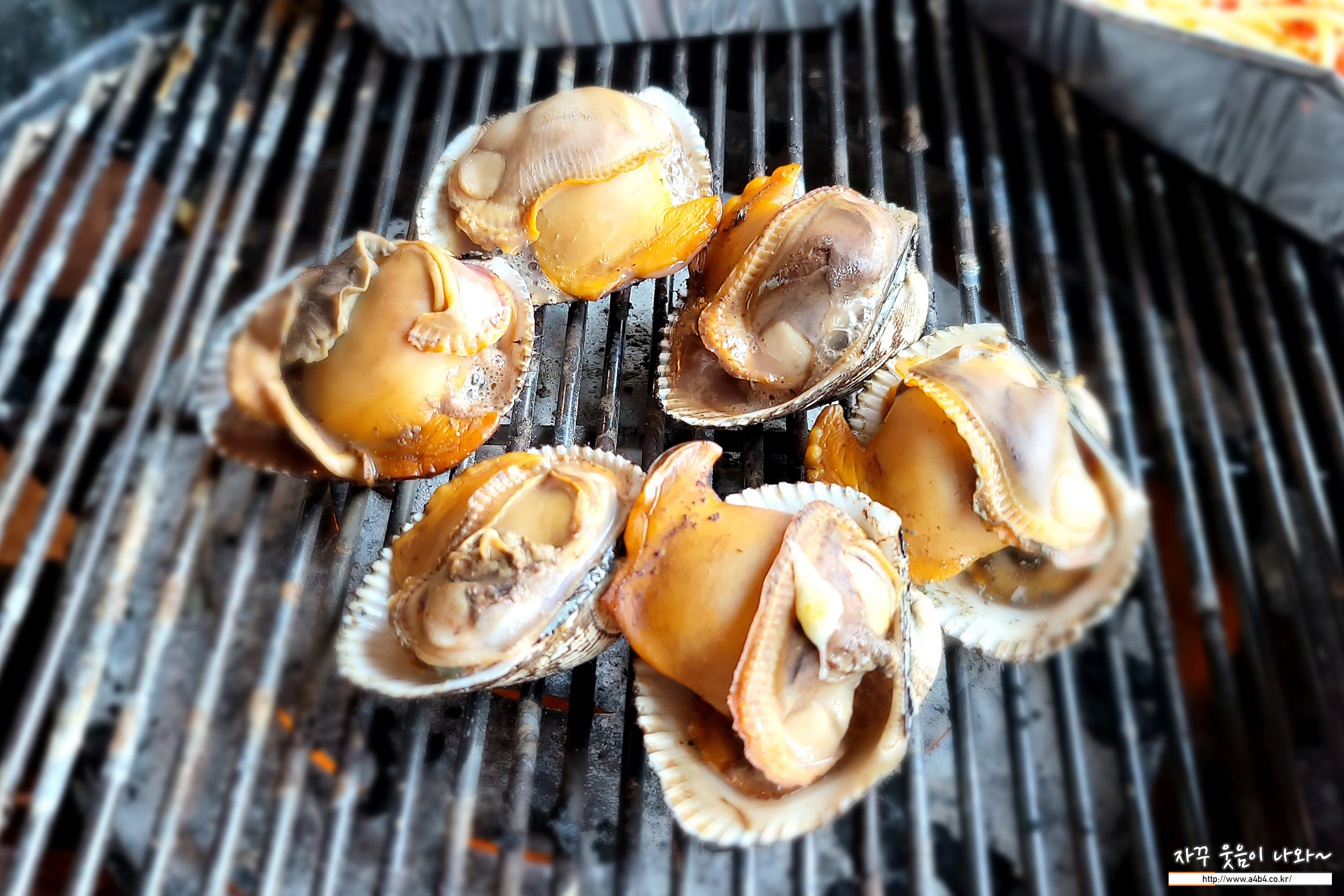 참고로 조개는 중간에 한 번 뒤집어야 합니다. 불쪽 부분의 관자가 떨어지면서 윗쪽에 조개가 붙게 되는데요. 중간에 한 번 뒤집어야 타지 않고 잘 익습니다. 전복은 중간에 한 번 젓가락 등으로 구멍을 한 번 내주세요. 안 그러면 탁 튀면서 다칠 수 있습니다.