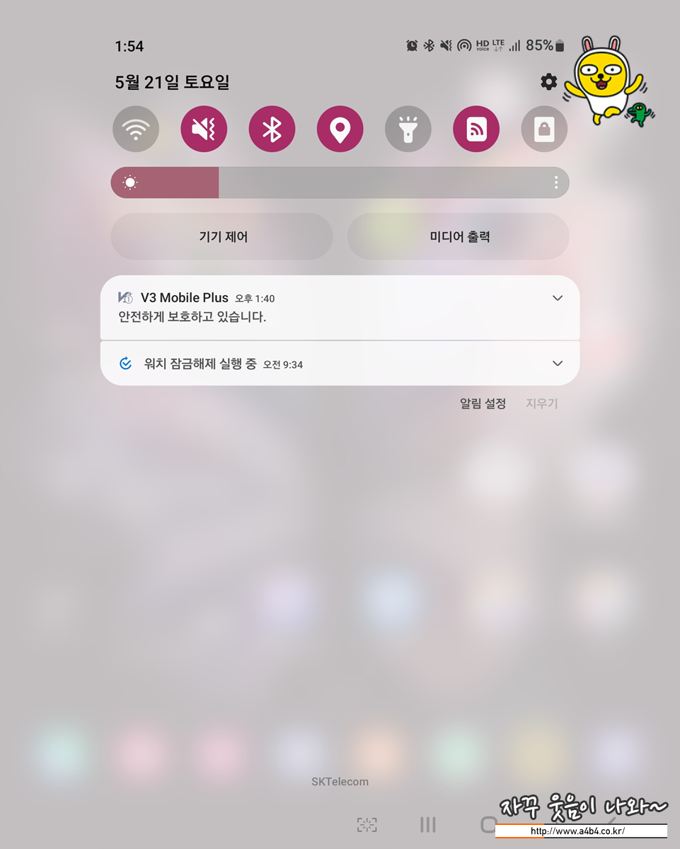 먼저 스마트폰 상단을 내려서 톱니바퀴 모양의 설정 선택 그리고 설청 창에서 '배터리 및 디바이스 케어' 선택합니다.