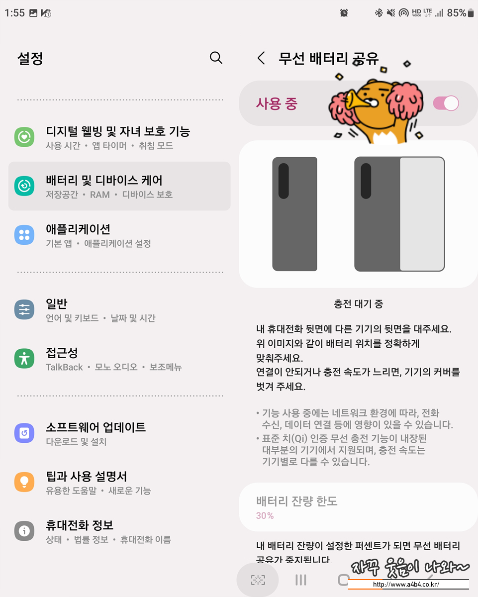 디바이스 케어메뉴에 접속하 면, 여기에서 배터리 선택 이후 '무선배터리 공유'선택하세요