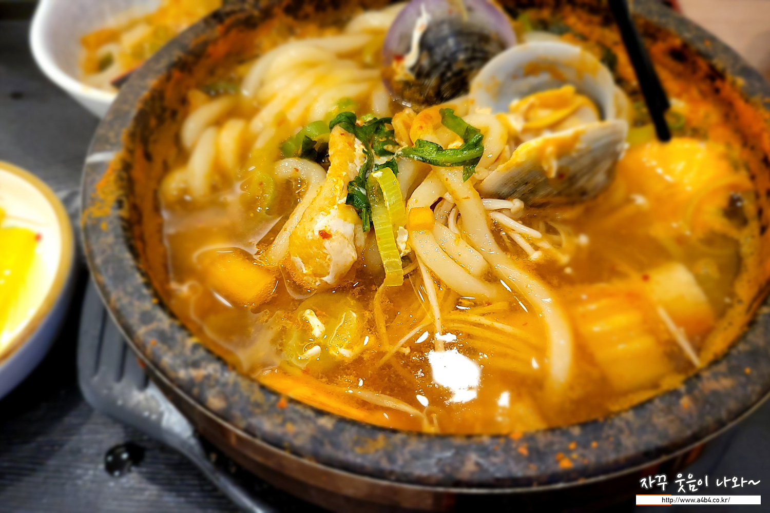 탱탱한 우동국수와 시원한 해물이 들어있는 얼큰한 맛의 돌냄비 우동입니다. 이곳 현대백화점 무역센터점 송의 인기메뉴 중 하나