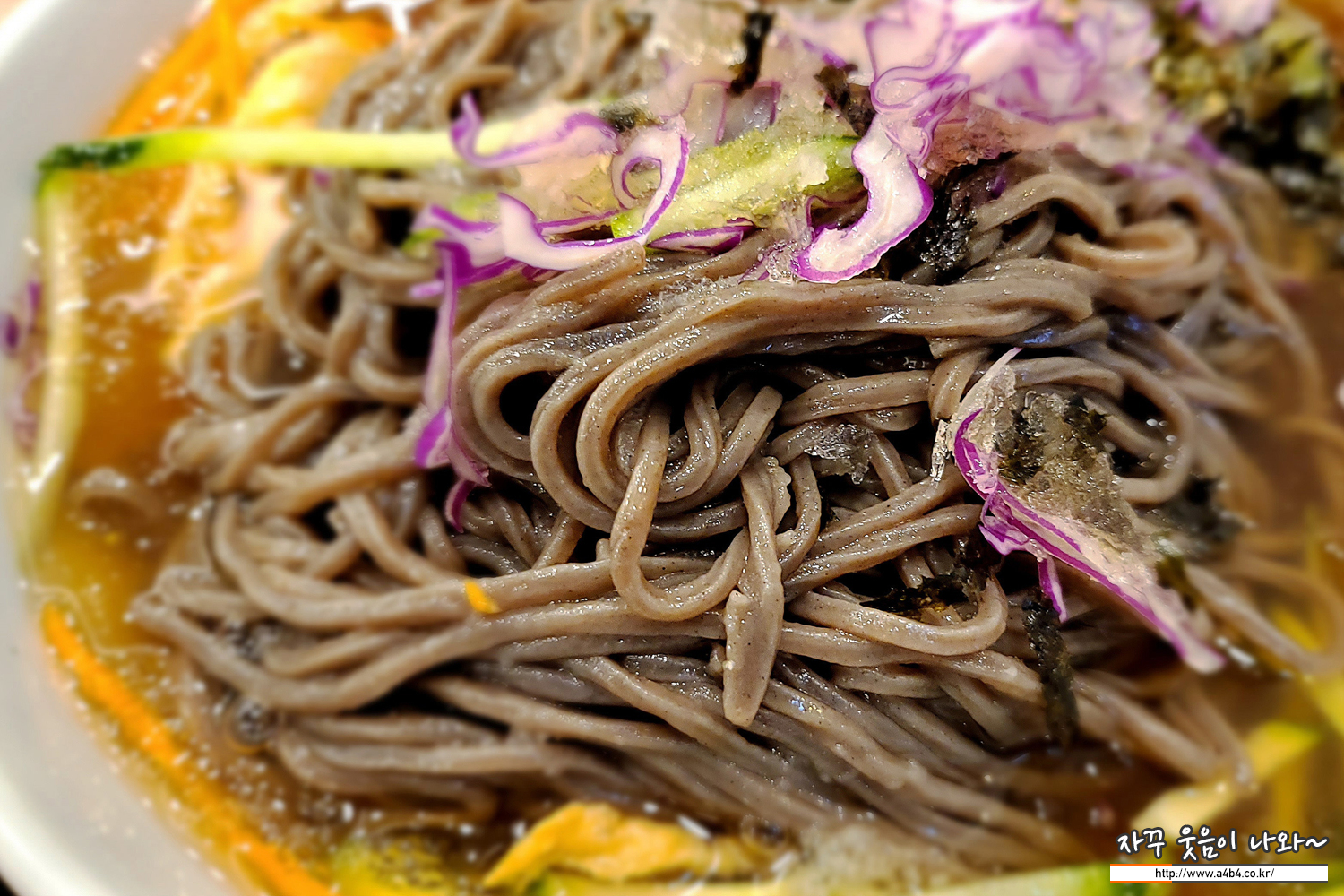 모밀은 탱탱한 식감을 보입니다. 여기에 푸짐한 야채가 잘 어울리는 요리입니다.