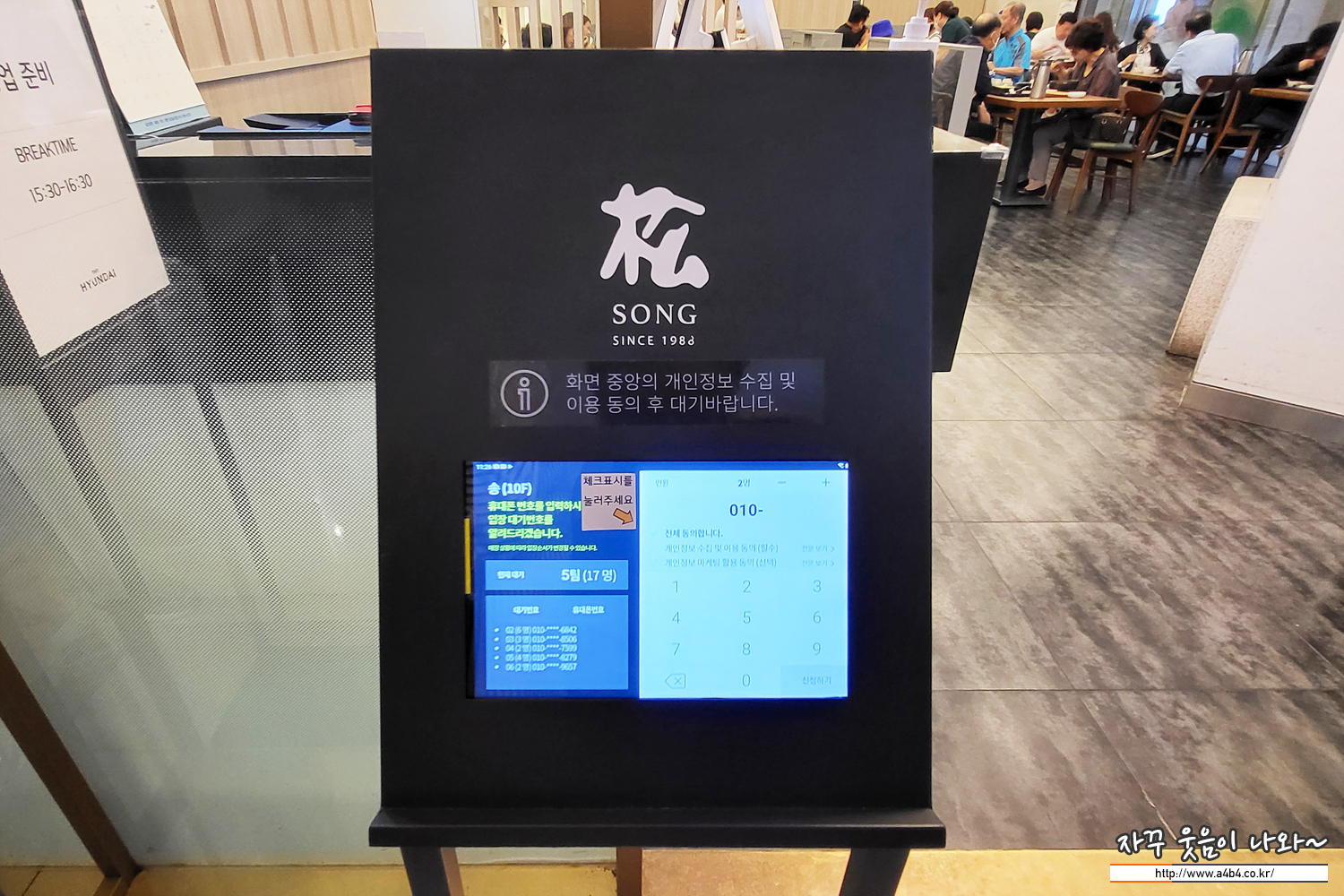 아래와 같이 태블릿에서 휴대전화번호와 이름, 방문인원을 기록하면 자동으로 순서가 등록됩니다.