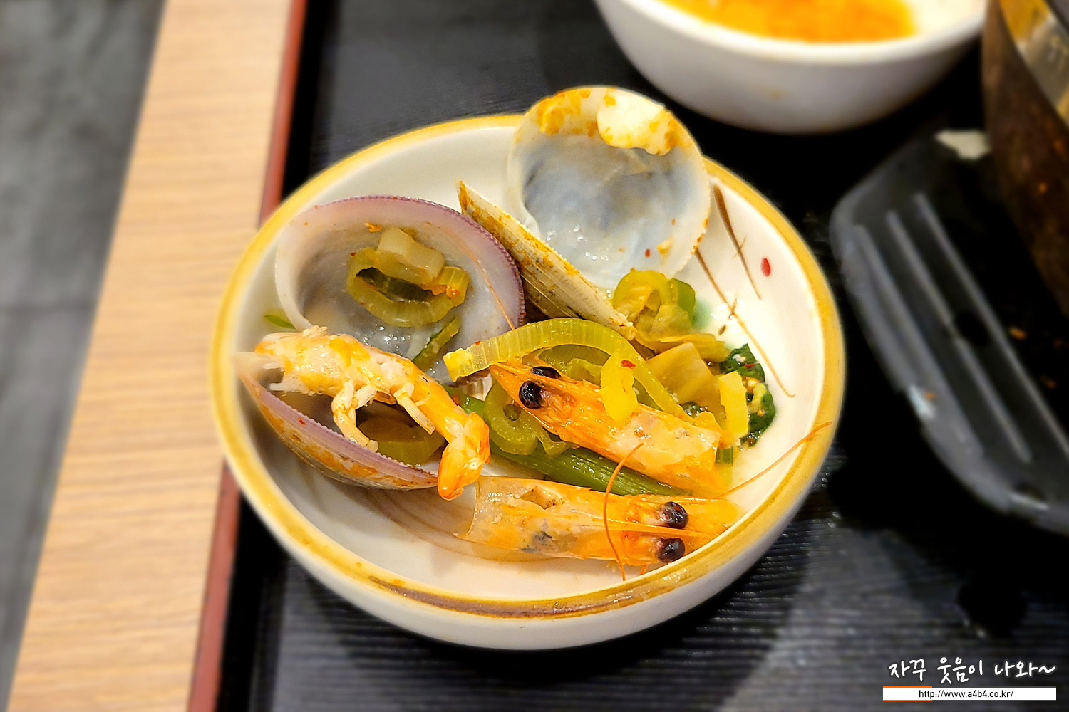 돌냄배 우동에 조개와 새우들이 들어 있어 얼큰하고 시원한 맛을 보이네요.