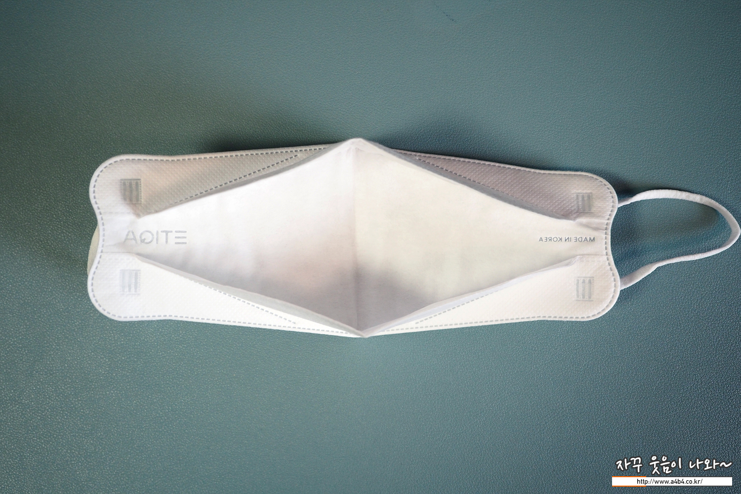 KF94 에티카 에어라이트 스탠다드 마스크는 고급형 마스크에 종종 사용되는 납작한 디자인의 이어밴드가 마스크 앞부분에 부착되어 있습니다. 에티카의 삼선 압인도 보이네요.