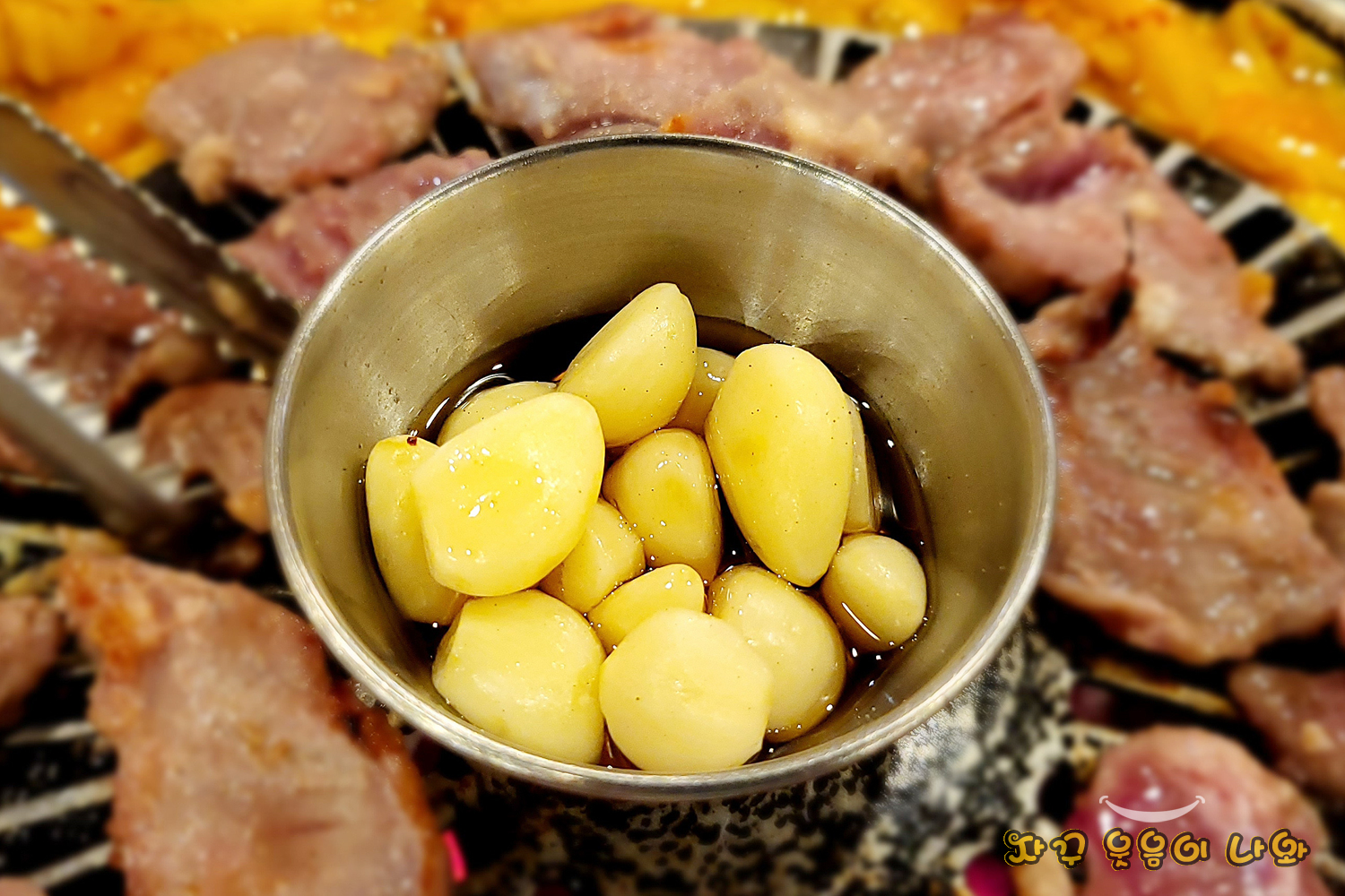 다시 불판위에 마늘도 올리고, 기름장과 함께 잘 구워 (튀겨)지네요. 작은 알마늘이다 보니 한 번에 한 알씩 먹기에도 좋더라는... 중딩 딸아이도 처음 맛보고 계속 먹네요.
