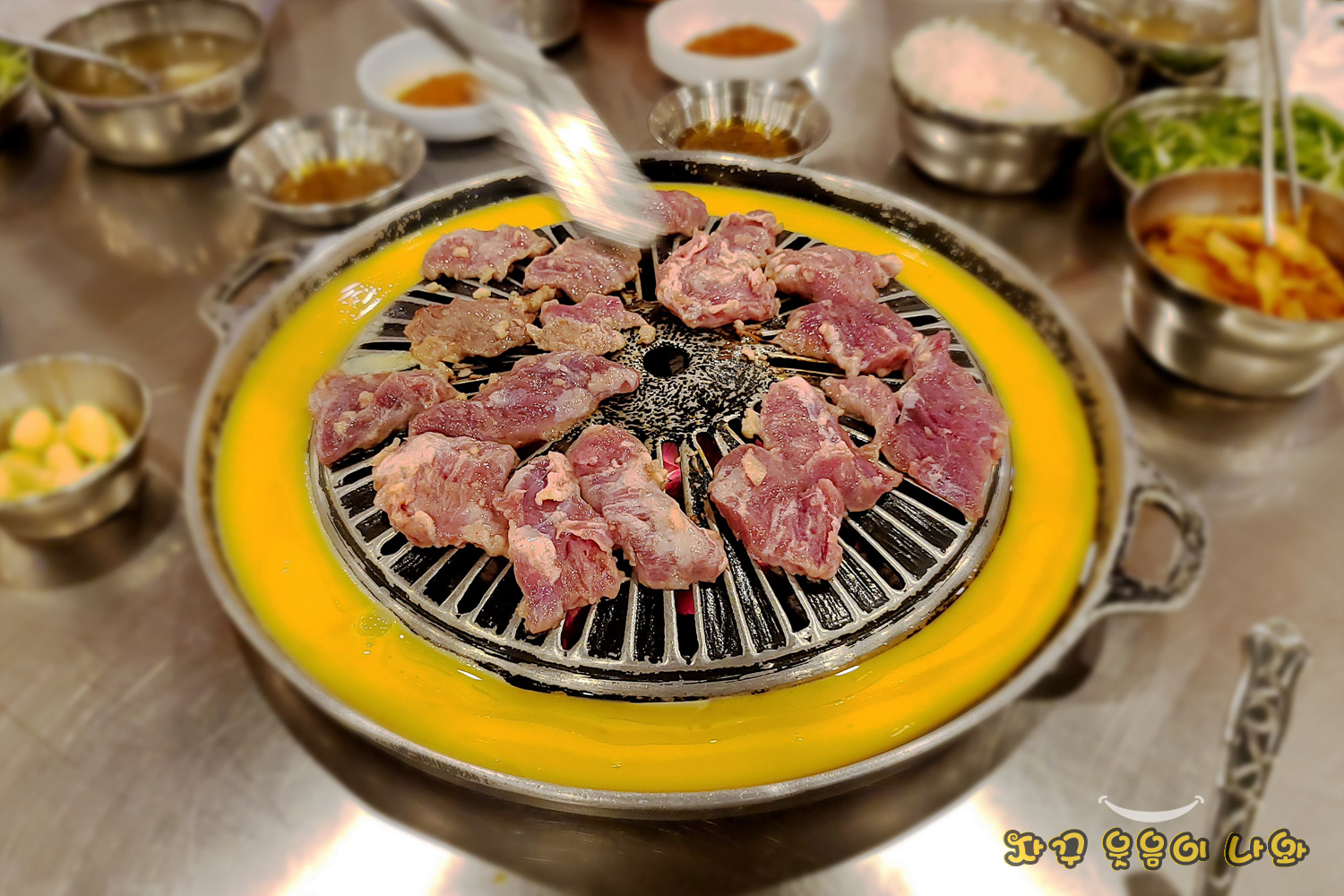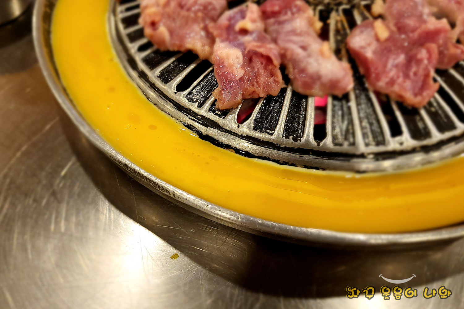 고기를 올리고 있으면 이렇게 불판 바깥쪽으로 계란물을 부어 주십니다. 딸아이가 이곳에 오자고 하는 이유 중 하나
