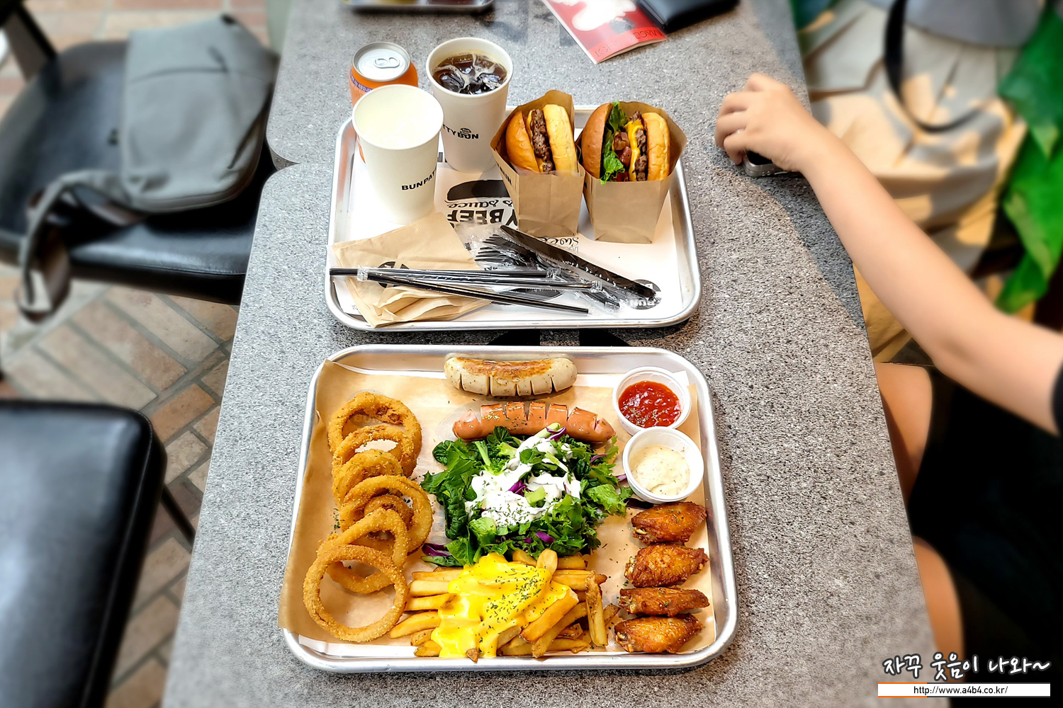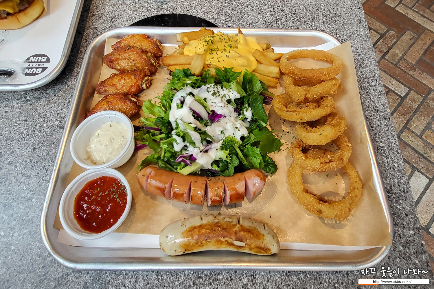그린샐러드, 아메리칸윙, 어니언링, 소시지, 치즈프라이가 세트로 나오는 플래터 입니다. 일행중에 햄버거를 싫어하거나 또는, 햄버거와 함께 사이드 메뉴로 먹기에 좋은 구성입니다.