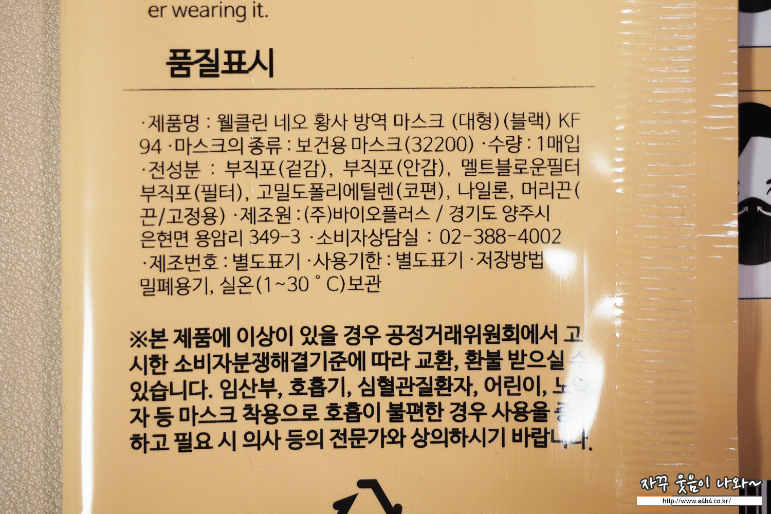 식약처 의약품안전나라 등록명칭은 '웰클린네오황사방역마스크' KF94 입니다. 마스크 크기는 대형, 중형, 소형이 잇으며, 컬러는 화이트와 블랙, 그레이 컬러가 있습니다. 마스크 제조사는 주식회사 바이오플러스로 20년 5월 승인된 제품입니다.