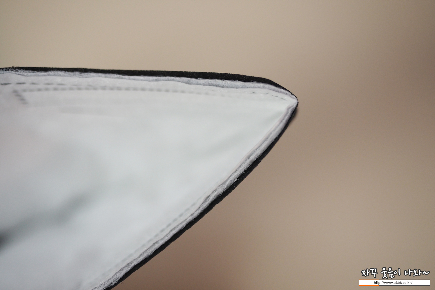 마스크 겉면은 패턴처리된 부직포가 사용되었습니다. 유광블랙 타입으로 조명상태에 따른 발색의 변화가 좀 있는 제품입니다. 전반적으로 마스크 염색 상태는 깔끔하게 잘 처리되어 있습니다.
