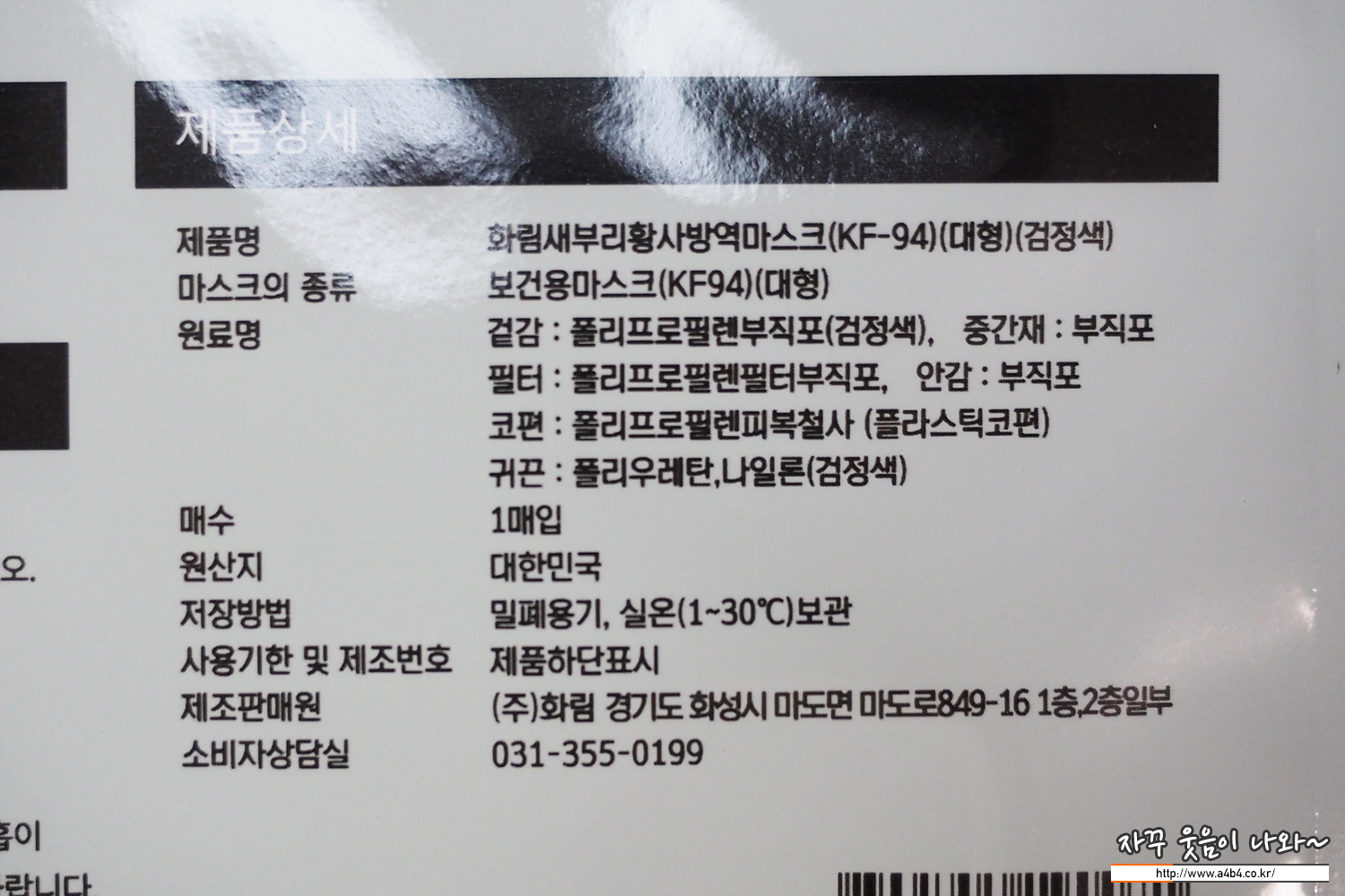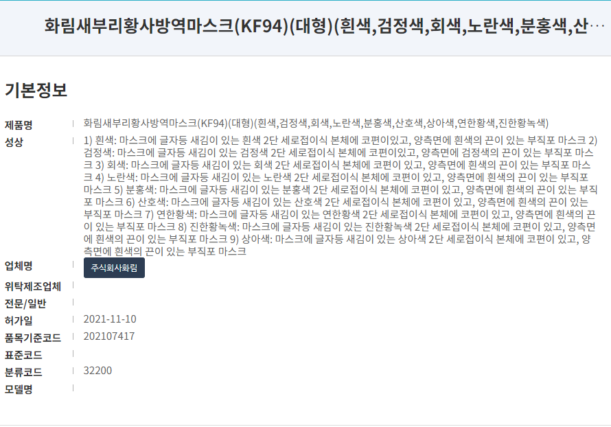 의약품안전나라 등록 명칭은 '화림새부리황사방역마스크(KF94)'입니다. 마스크 사이즈는 대형 컬러는 블랙과 화이트가 있습니다. 마스크 제조사는 주식회사화림으로 21년 11월 허가된 제품입니다.해당 제품에 대한 식약처 불량마스크 등록 이력은 없습니다.