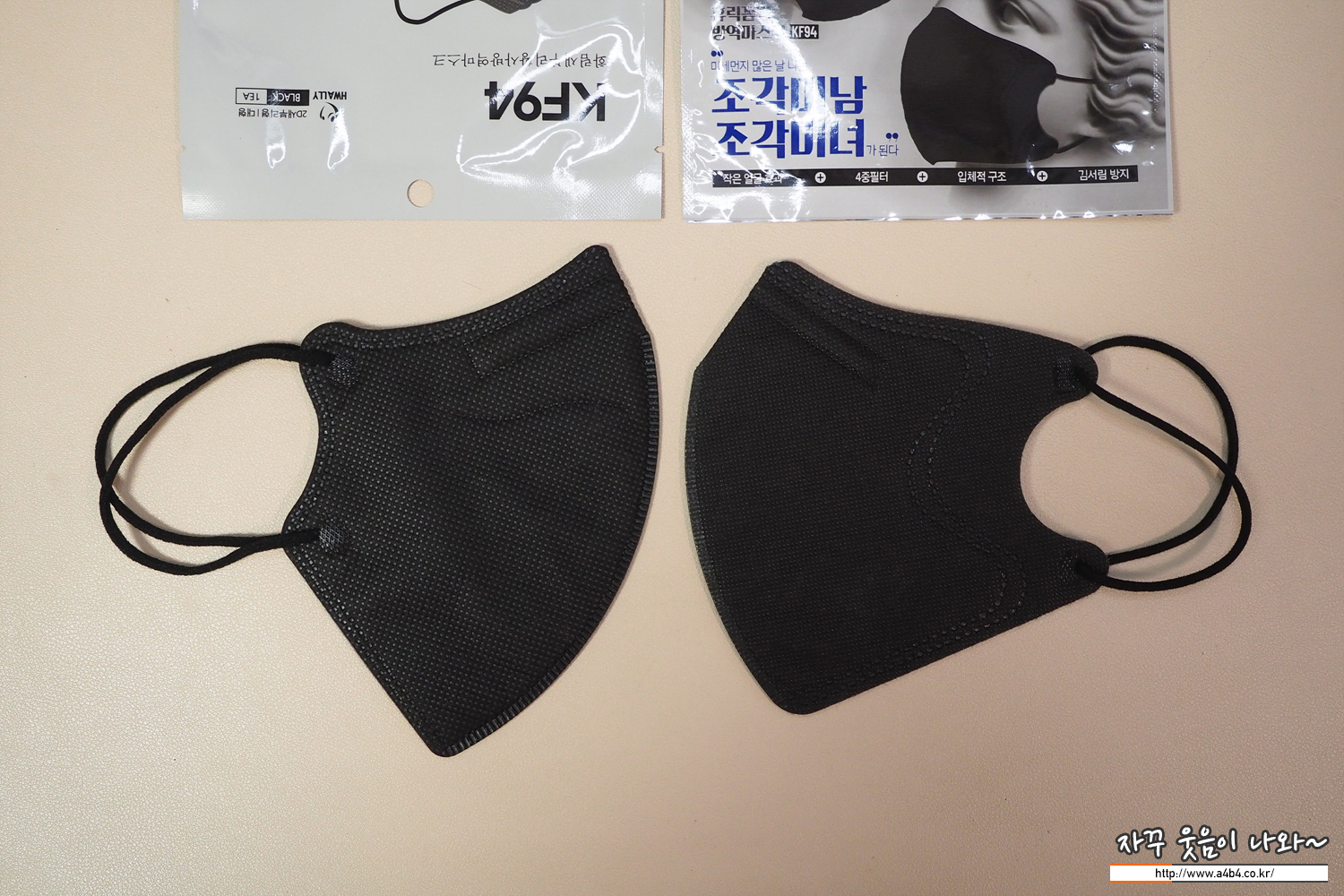 레이온 부직포 사용으로 소프트하지만 가장 깊은 블랙을 보이는 리앤웰 마스크 대형과 색상 비교