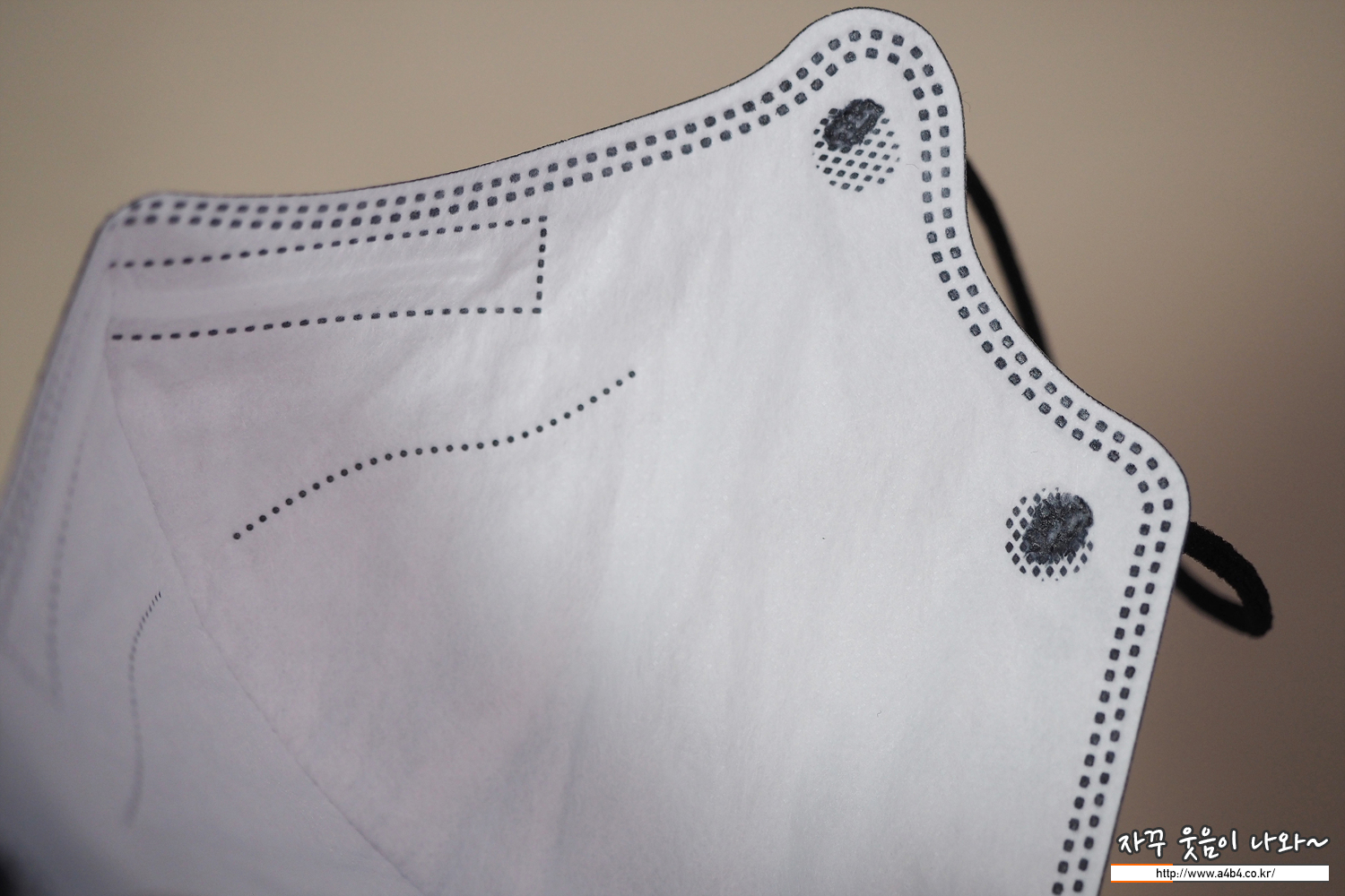 원형의 귀걸이끈이 마스크 앞부분에 부착되어 있으며, 부착 상태는 양호합니다. 또한 귀걸이끈 탄력 및 굵기는 일반적인 수준입니다. 고급 칼국수 귀걸이끈이 사용되지 않은 부분은 다소 아쉬운 부분입니다.