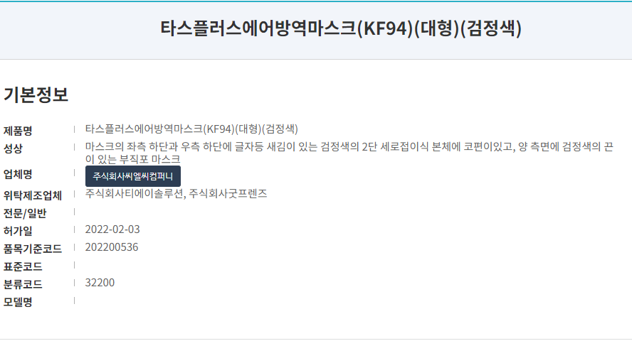 '타스플러스에어방역마스크KF94' 로 사이즈는 대형, 컬러는 화이트와 블랙이 있습니다. 올해인 22년 2월 승인된 마스크로 마스크 제조업체는 '주식회사씨엘씨컴퍼니'로 등록되어 있습니다. 이 외에도 '타스(TAS)' 브랜드로 몇몇 제품을 생산하고 있습니다. 해당 제품은 불량마스크 등록이력 없습니다.
