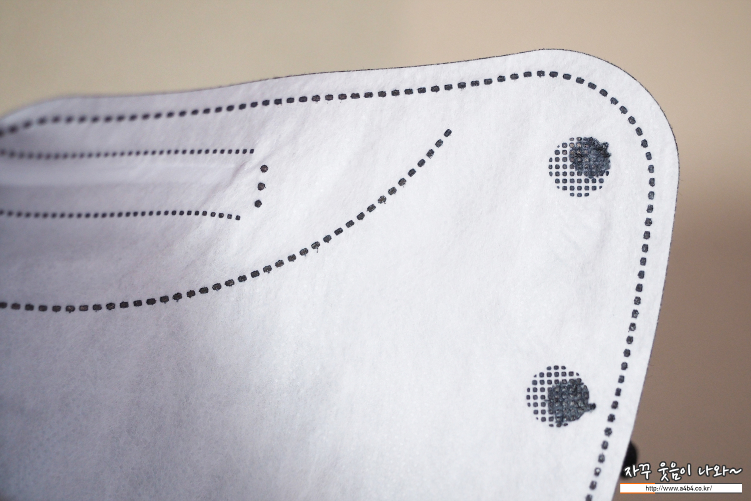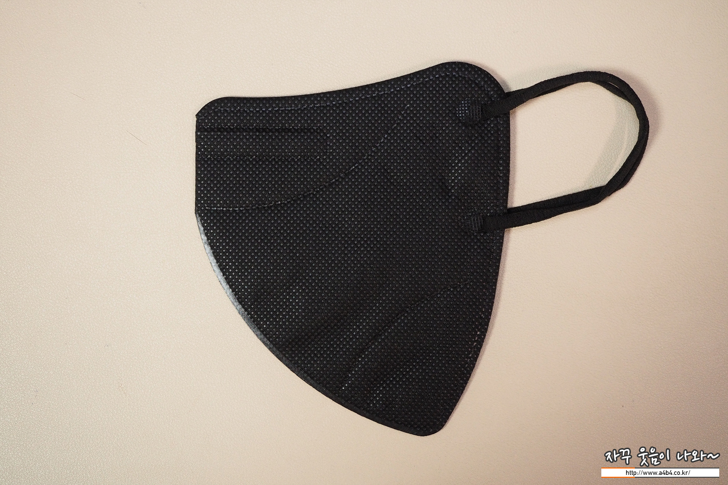 쿤달 마스크 블랙 겉감은 패턴 처리된 검정색 부직포가 사용되었습니다. 염색 상태는 무난하며 빛 반사에 민감한 유광블랙 발색을 보여주고 있습니다.