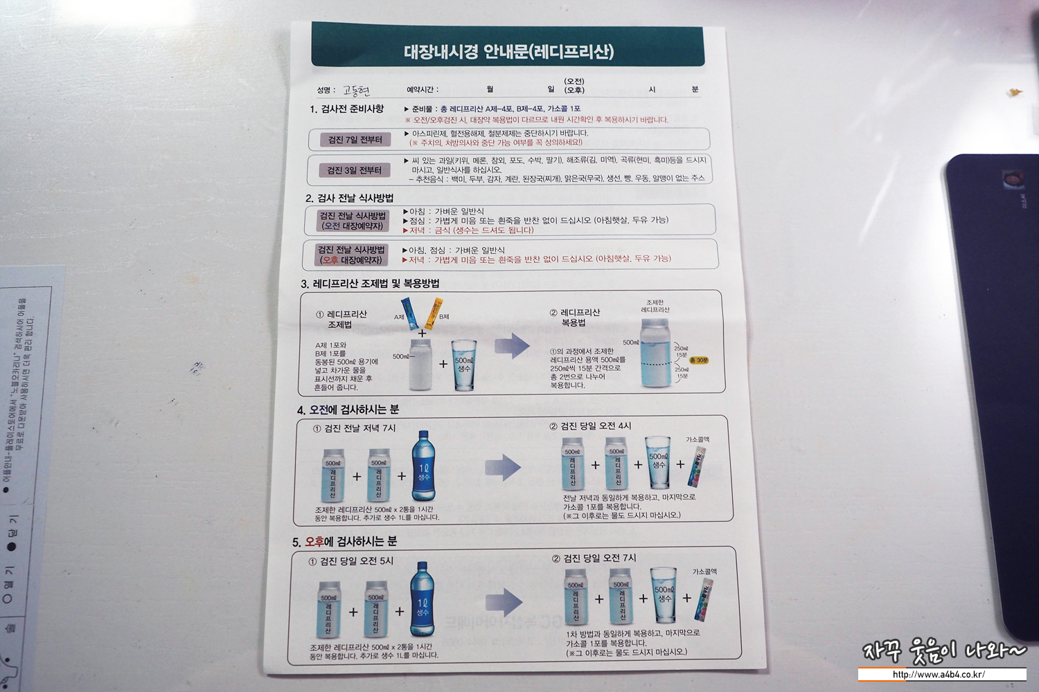 그리고 저녁 7시에 첫 대장내시경 약을 복용하는데요. 이 첫 복용부터 마지막 복용시간인 새벽 4시 45분 까지 약을 먹을때 약간의 역겨움과 잦은 화장실 방문으로 응꼬가 헐 것 같은 고통을 제외하는 큰 부작용이 없는 경우입니다.
