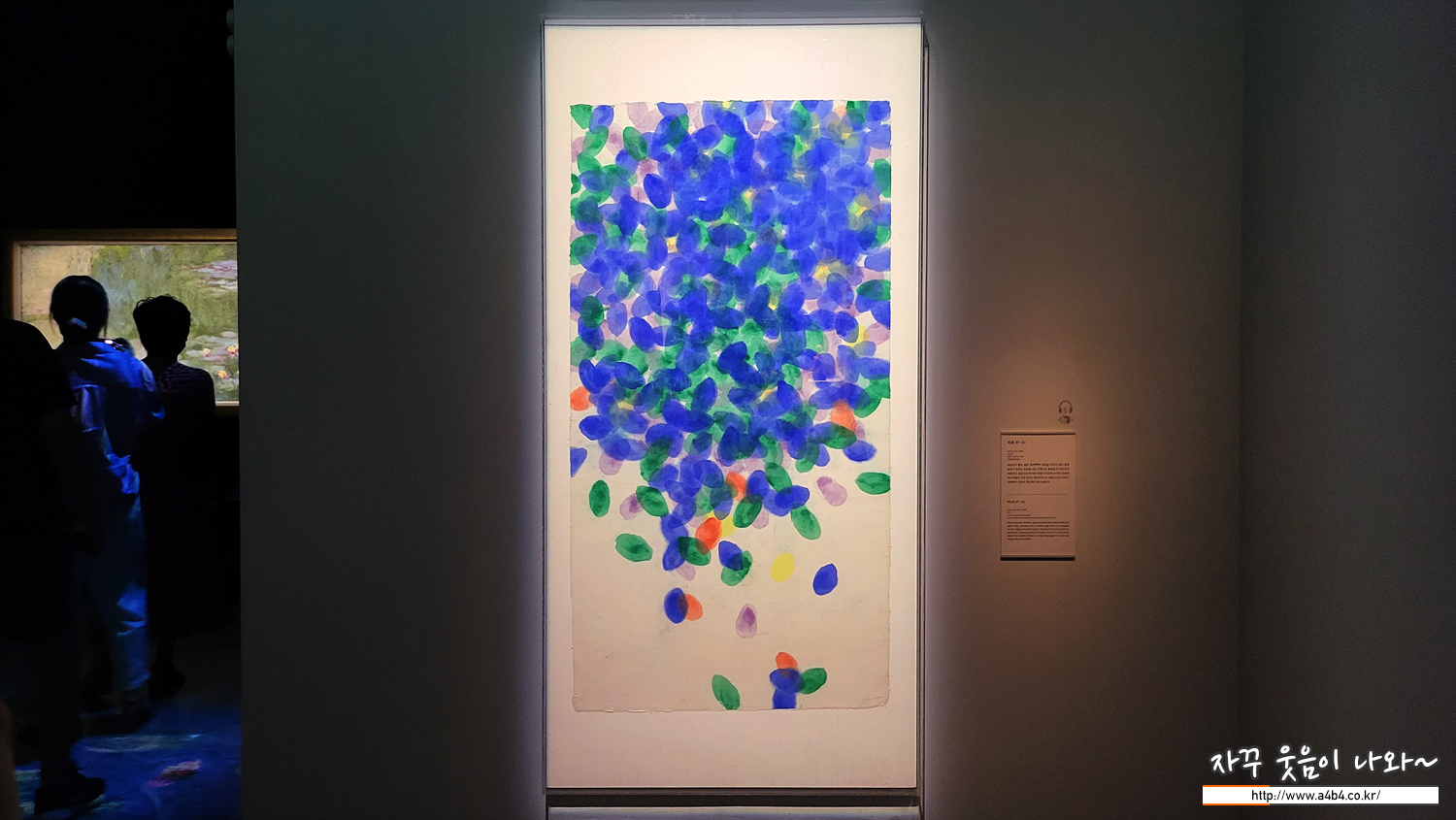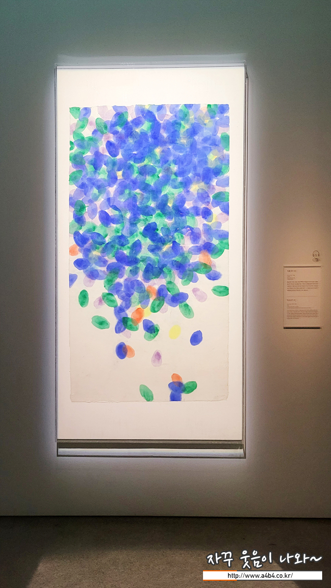흡습성이 좋은 얇은 화지和紙에 색점을 무수히 많이 칠해 물감이 번지는 효과를 내는 기법으로 활동을 한 곽인식의 작품입니다. 물감 농도에 따라 색점이 다르게 보이며, 관점에 따라 색점이 서로 밀치고 흩어집니다. 이 작품과 조선 19세기 청화백자 문양의 푸른색이 잘 어울립니다.
