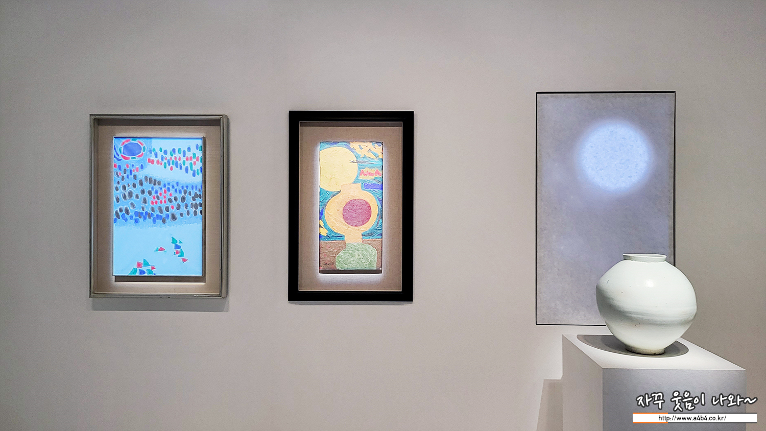가장 왼쪽에 걸린 1968년 작품은 푸르스름한 배경에 빨간색, 파란색, 검정색 점을 찍은 그림입니다. 1960년대에 뉴욕에 정착한 김환기가 더 완전한 추상 회화를 시도하면서 그린 것입니다. 하지만 그림 왼쪽 위를 가만히 보세요. 큼직한 동그라미에서 달이 연상되고, 그 주변의 점들은 수많은 별처럼 보입니다. 김환기가 그리고 싶었던 마음의 풍경은 달과 달항아리에 뿌리내리고 있었나 봅니다. 시작은 항아리였지만 그 끝은 추상 회화가 된, 김환기의 달 이야기였습니다.