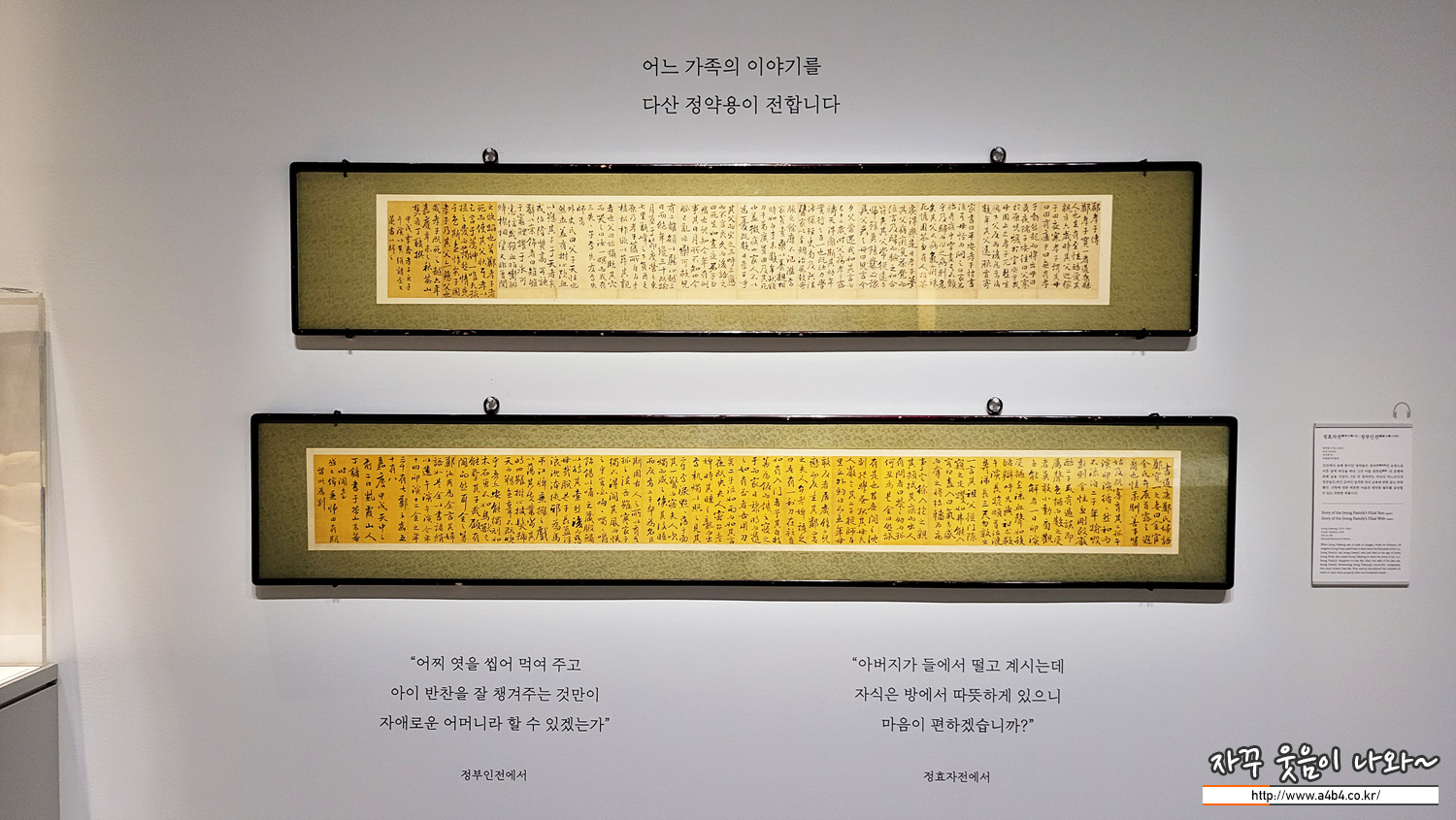 200년 전 조선시대 글이 위아래로 걸려있습니다. 위쪽 액자는 <정효자전>입니다. 전라도 강진 사람 정여주는 먼저 세상을 떠난 아들이 너무나 보고 싶었습니다. 손주들을 홀로 키우는 며느리도 안타까웠지요. 마침 고을에 귀양살이 온 선비가 그렇게 글을 잘 쓴다고 합니다. 그래서 선비에게 가족 이야기를 글로 남겨달라고 부탁했습니다. 그 선비는 다산 정약용이었습니다. 가족과 떨어진 유배 생활이 벌써 10년이 지나고 있었으니, 아들을 잃은 아버지 마음이 남 일 같지 않았을 것입니다.