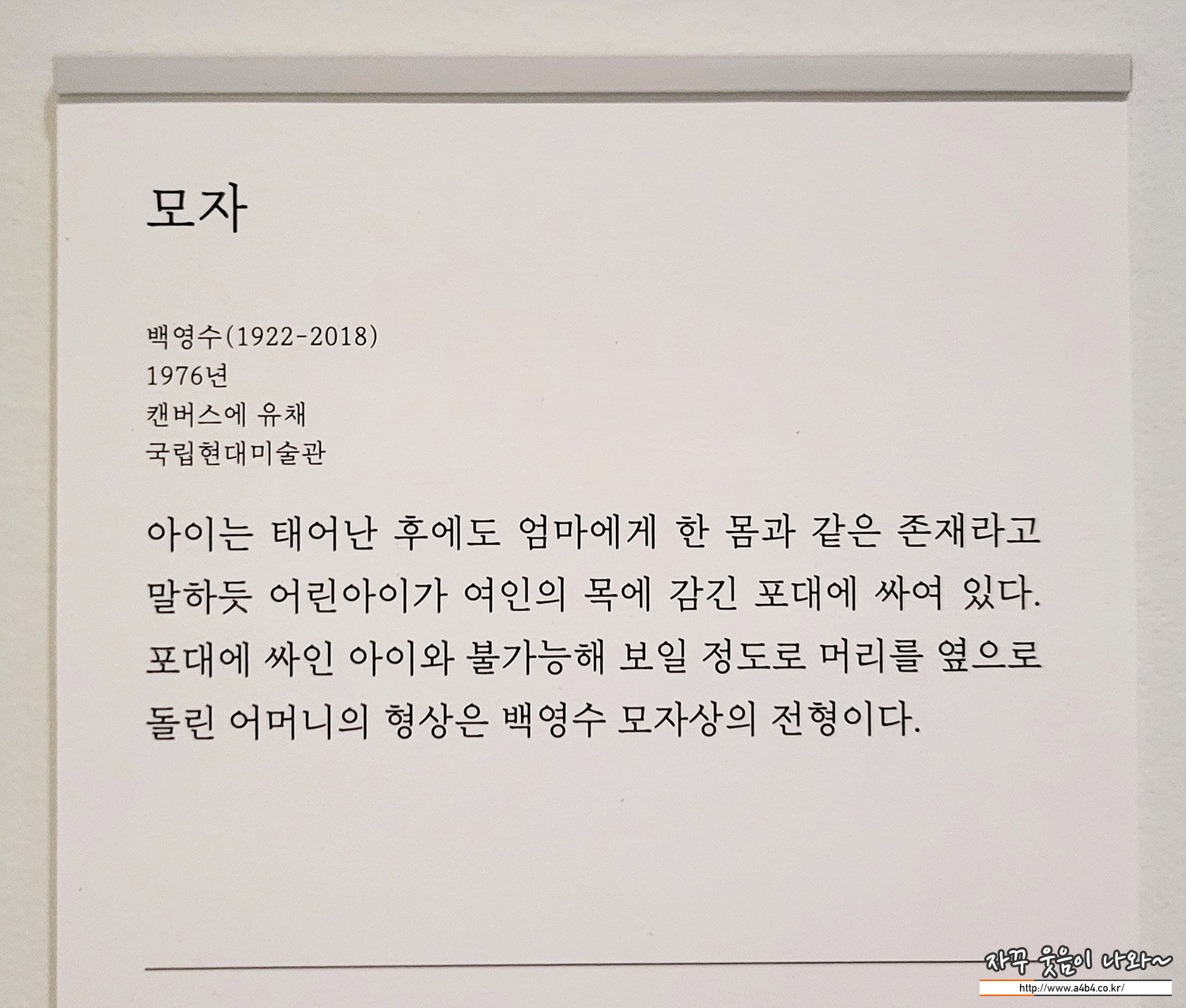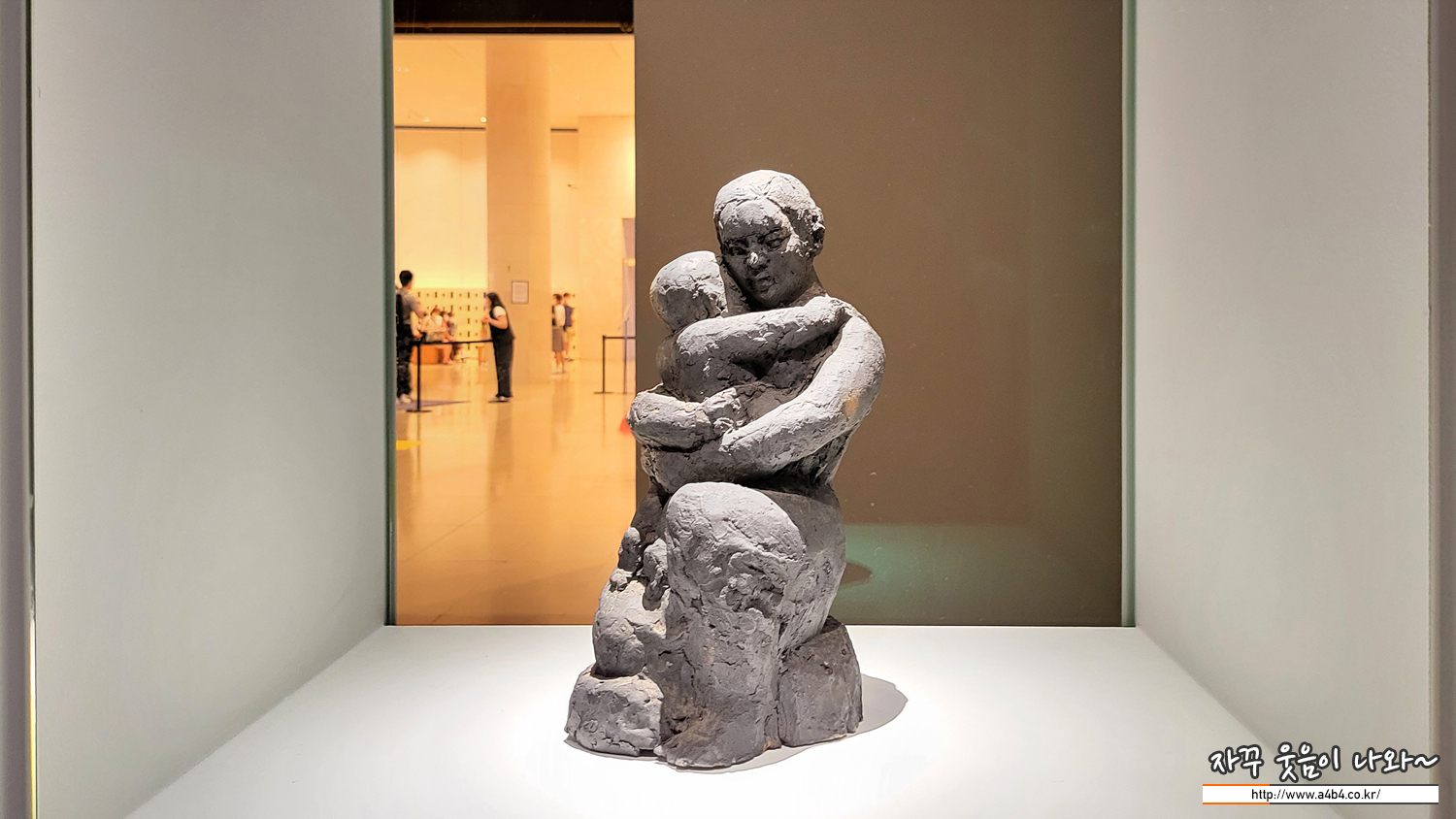 여인의 시선과 입매, 그리고 아이를 두 다리로 받치고 탄탄한 양팔로 감싸 안은 자세에서 긴장감이 전해집니다. 엄마의 든든한 보호를 받고 있는 아기는 평온하기만 합니다. 권진규 특유의 사실성과 정신성이 잘 드러나는 작품입니다.