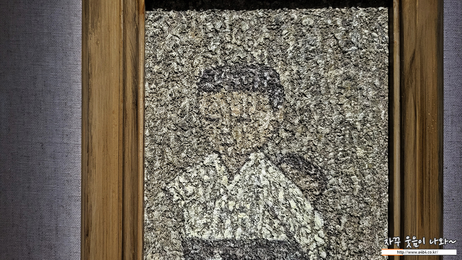오른쪽으로 들어서니 기와집이 있는 종이부조가 보입니다. 작품 제목은 <김씨연대기>입니다. 가만히 보면 기와집 아래에 거인처럼 큰 노부부가 누워있습니다. 황토 땅 위에 긁어 그린 것처럼 윤곽만 보입니다.