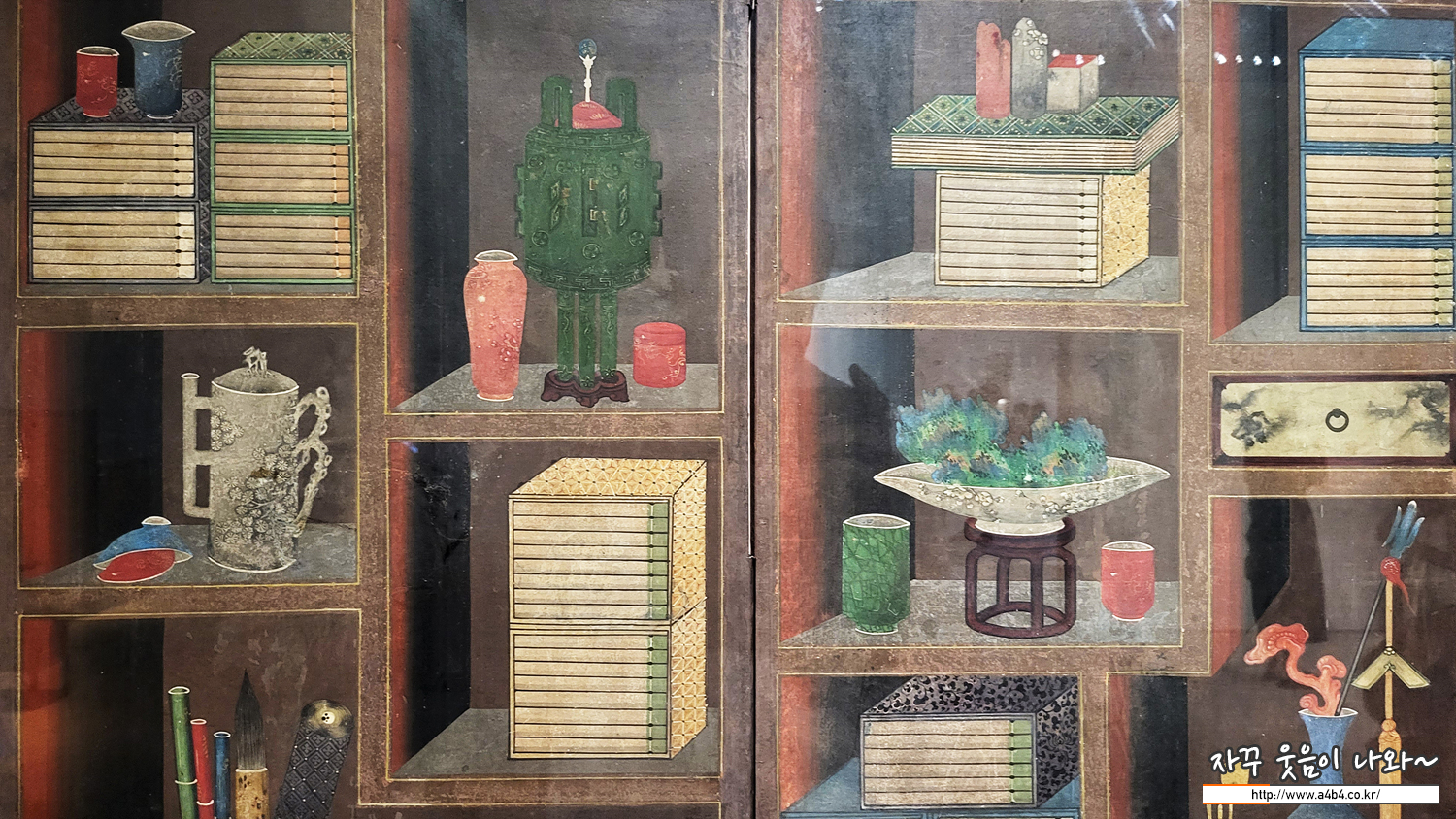 <책가도 병풍> 왼쪽에는 한옥 방 같은 공간에 여러 가지 목가구가 놓여 있습니다. 가구는 공간입니다.