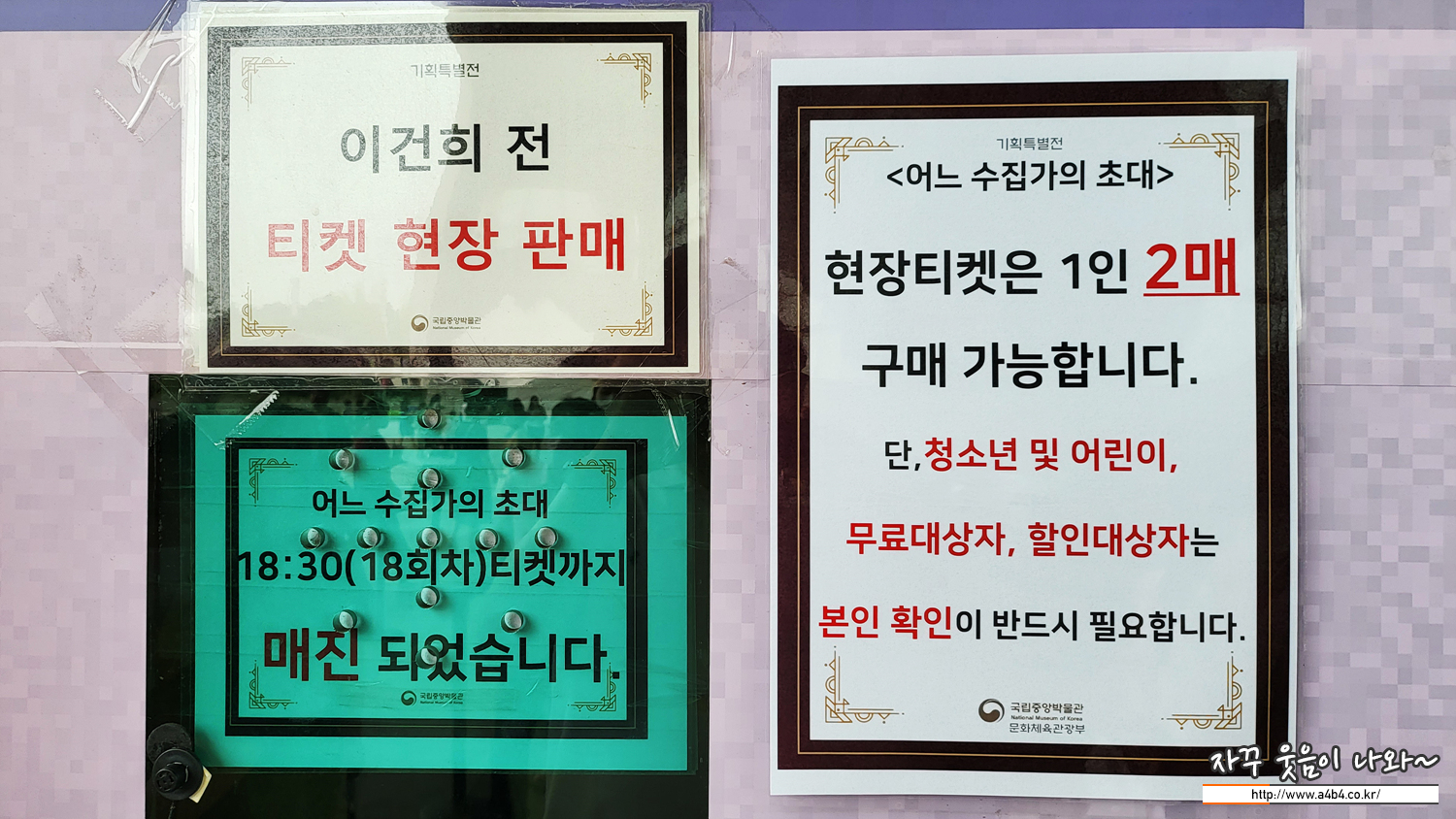 이미 두 방법 모두 쉽지는 않습니다. 이건희 전시회 온라인 예약은 이미 마감되어, 인터파크티켓 사이트에 잠복하면서 취소표를 기다리거나, 관람일 오전 일찍 현장에 와야 당일 티켓을 구할 수 있습니다. 저는 오후 2시 30분 예약한 티켓을 발권하러 왔는데, 이미 당일티켓은 다 마감이네요.