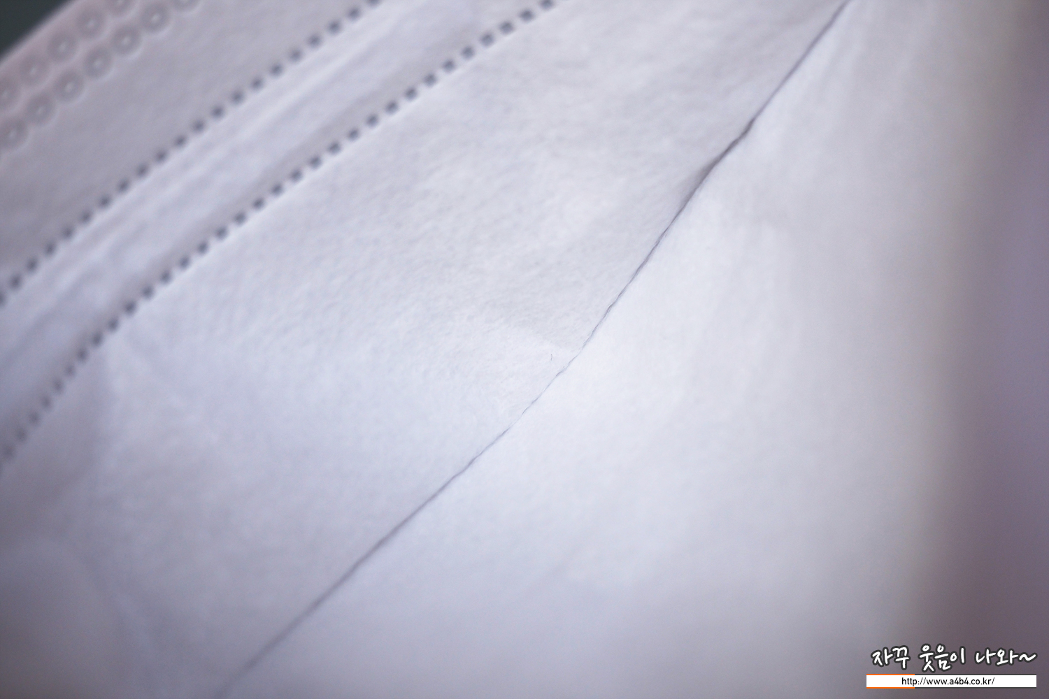 KF94 독도 마스크 대형 안감은 드라이한 촉감의 부직포가 안감으로 사용되었습니다. 마스크에 약품냄새는 없지만 안감에 약간의 보풀이 보입니다. 다만 장시간 착용해도 코나 볼 부분이 가렵거나 간지러운 피부 트러블은 나타나지 않았습니다.