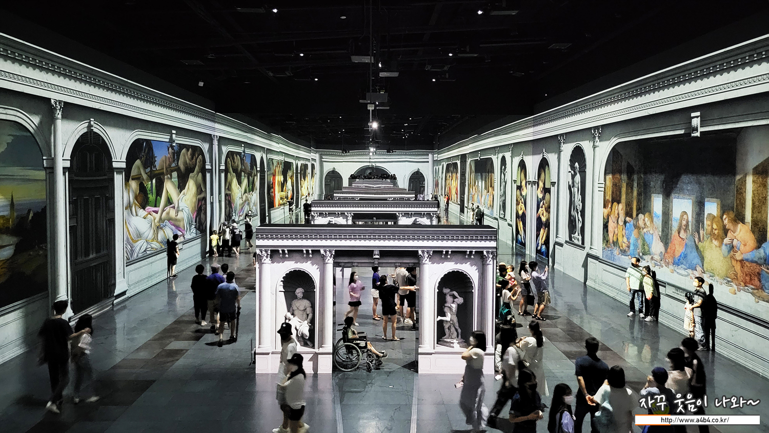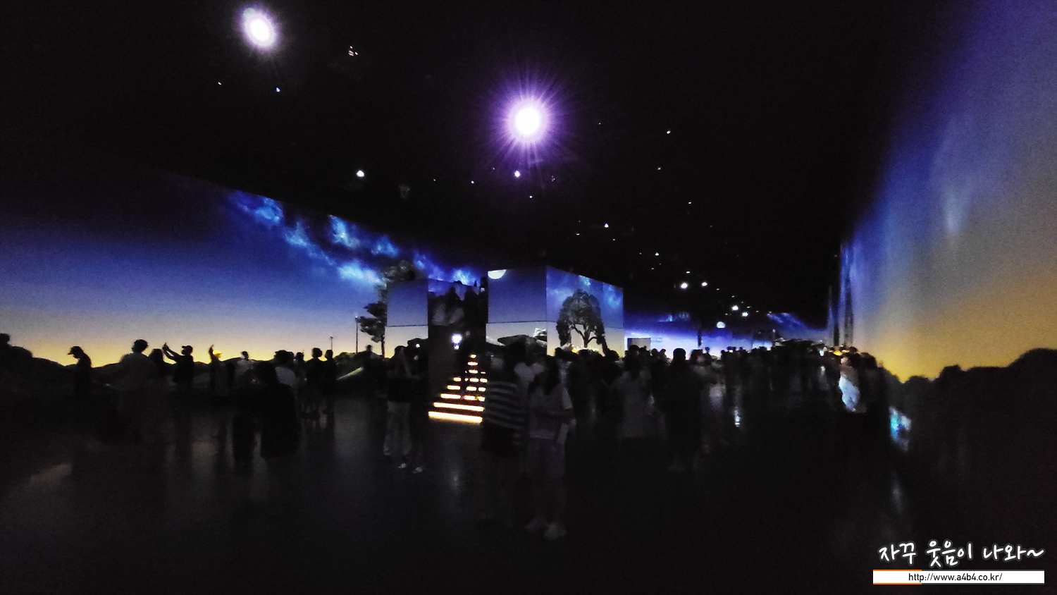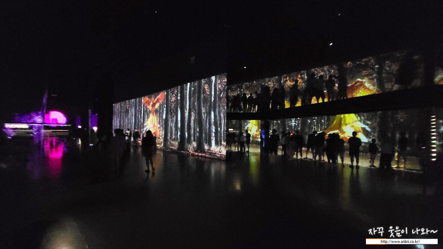 전시장은 이렇게 넓고 어두운 공간에 섹션별로 다양한 주제의 미디어아트가 전시되고 있다. 일부 전시공간은 2층으로 이동해야 하는데, 계단으로 구성되어 있어 일부 장애인은 이동이 어렵거나 다소 불편한 부분도 있다.