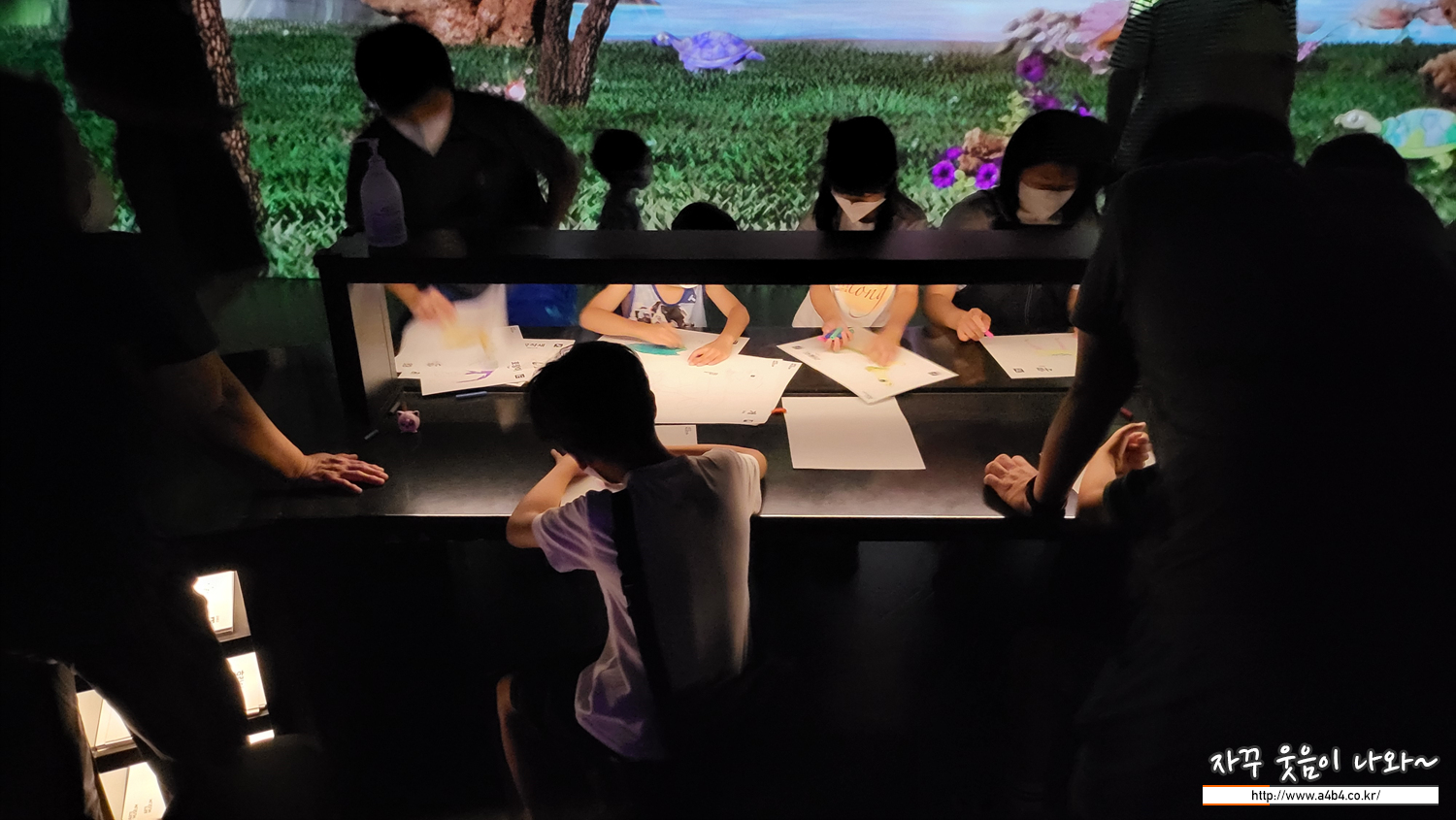 아이들 체험공간 제목과 같이 이곳 아르떼 뮤지엄에 등장한 동물들의 라인이 그려진 종이가 있고 이곳에 색칠할 수 있는...