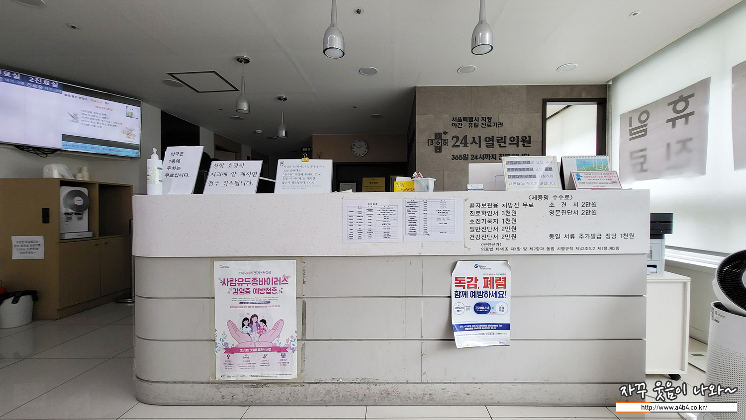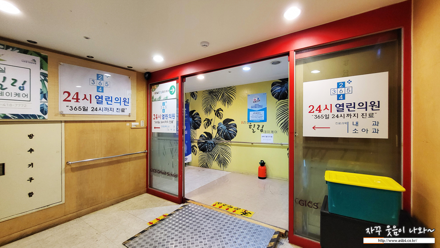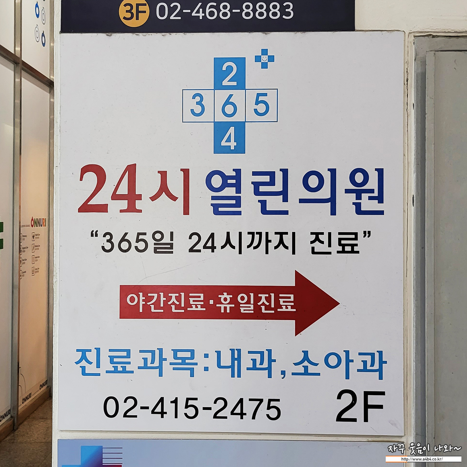 주차 후 2층으로 이동하시면 24시 열린의원이 있습니다. 또한 1층에는 같이 365일 평일 공휴일 문여는 약국인 '온누리약국'이 위치해 있어서 한 곳에서 진료 및 약수령이 가능한 장점이 있습니다.