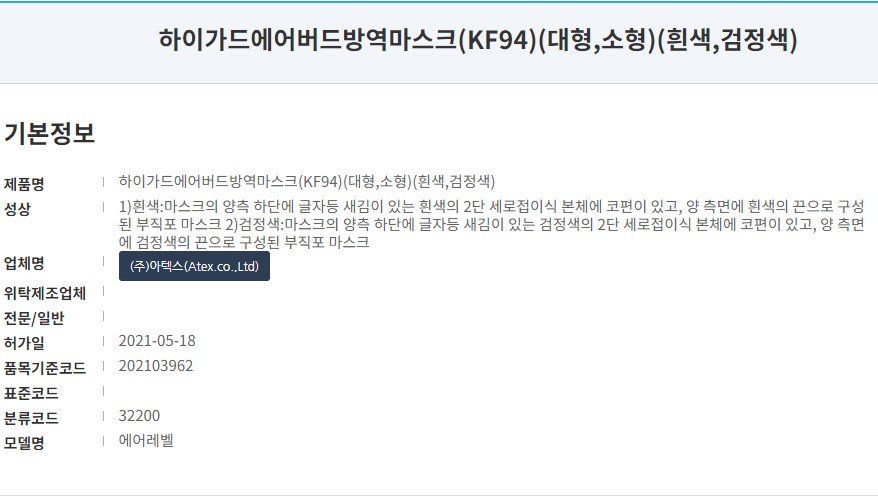 마스크 제조사는 '(주)아텍스(Atex.co.,Ltd)'로 2021년 05월 18일 허가된 마스크입니다. 아텍스는 하이가드 브랜드로 입체형 마스크나 팽수 마스크, 대박이 마스크 등을 판매하는 곳이기도 합니다.