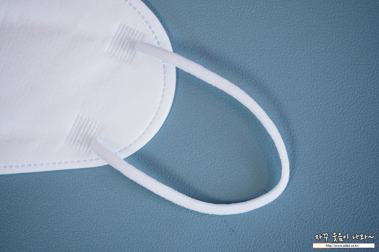 하이가드 에어버드 마스크 전면에는 납작한 타입의 폴리에스터/폴리우레탄끈이 부착되어 있습니다. 이어밴드 부착 상태는 양호하며, 탄력은 보통수준을 보여주고 있습니다.