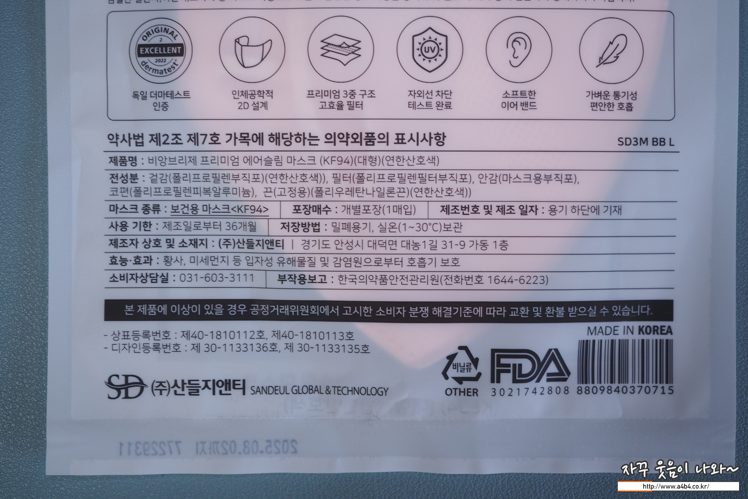 식약처 의약품 안전나라 제품명칭은 '비앙브리제프리미엄에어슬림마스크' KF94 타입 제품입니다. 사이즈는 대형과 중형, 컬러는 12가지 컬러가 준비되어 있습니다. 특히 여성분들이 좋아하는 컬러 중심으로 출시되어 있습니다. 오늘은 연한산호색 (베이비핑크) 컬러입니다.