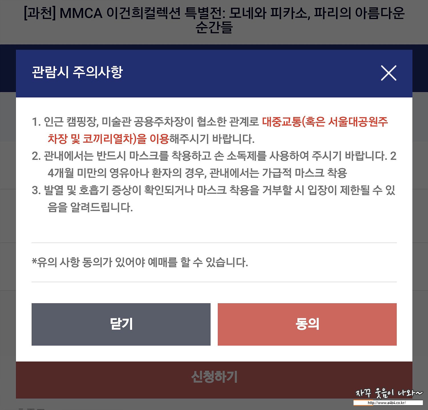 신청확인 클릭 후 관람시 유의사항과 매크로 방지를 위한 자동입력 방지문자를 한 번 더 확인하게 됩니다.