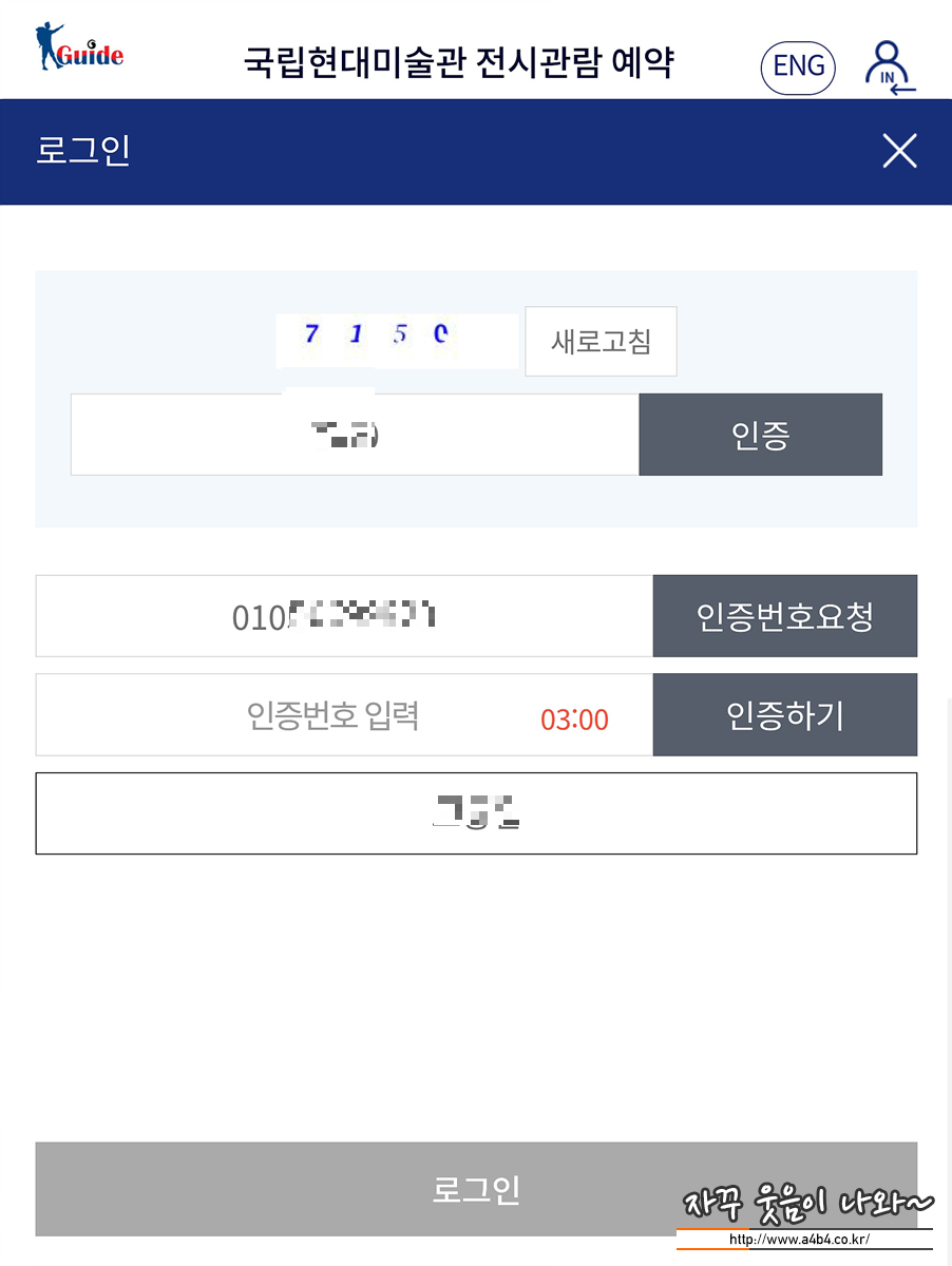 국립현대미술관 전시관람예약은 ID/PW로그인 방식이 아닌 매번 휴대폰 번호를 인증받아 진행하는 방식입니다. 즉 브라우져를 닫거나 시간이 지나 세션이 종료된면 다시 휴대폰번호 인증을 받아야 합니다. 인증문자를 수신해서 인증번호 입력하는 방식으로 약간의 시간이 소요되니, 이건희 특별전 예매시작시간인 저녁 6시 -10분 전후로 로그인하고 대기하세요.