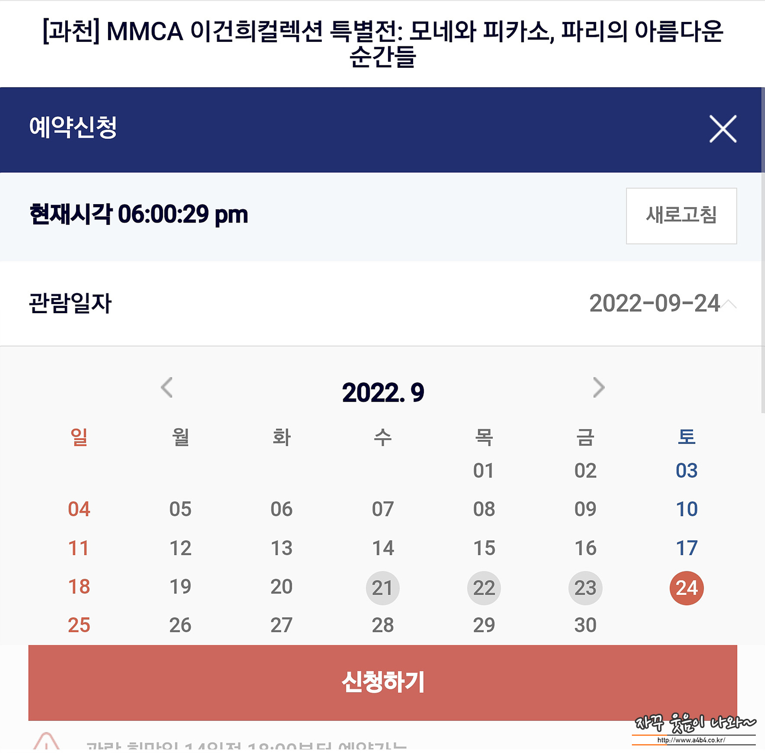 이번 과천 국립현대미술관에서 열리는 ' '이건희 컬렉션 특별전 : 모네와 피카소, 파리의 아름다운 순간들'은 총 8회차 회차별 70명으로 관람인원이 제한됩니다. 이미지와 같이 저녁 6시에 날짜가 붉은 원으로 활성화되면 날짜를 선택하고 추가로 아래 관람희망 시간을 선택하면 됩니다.