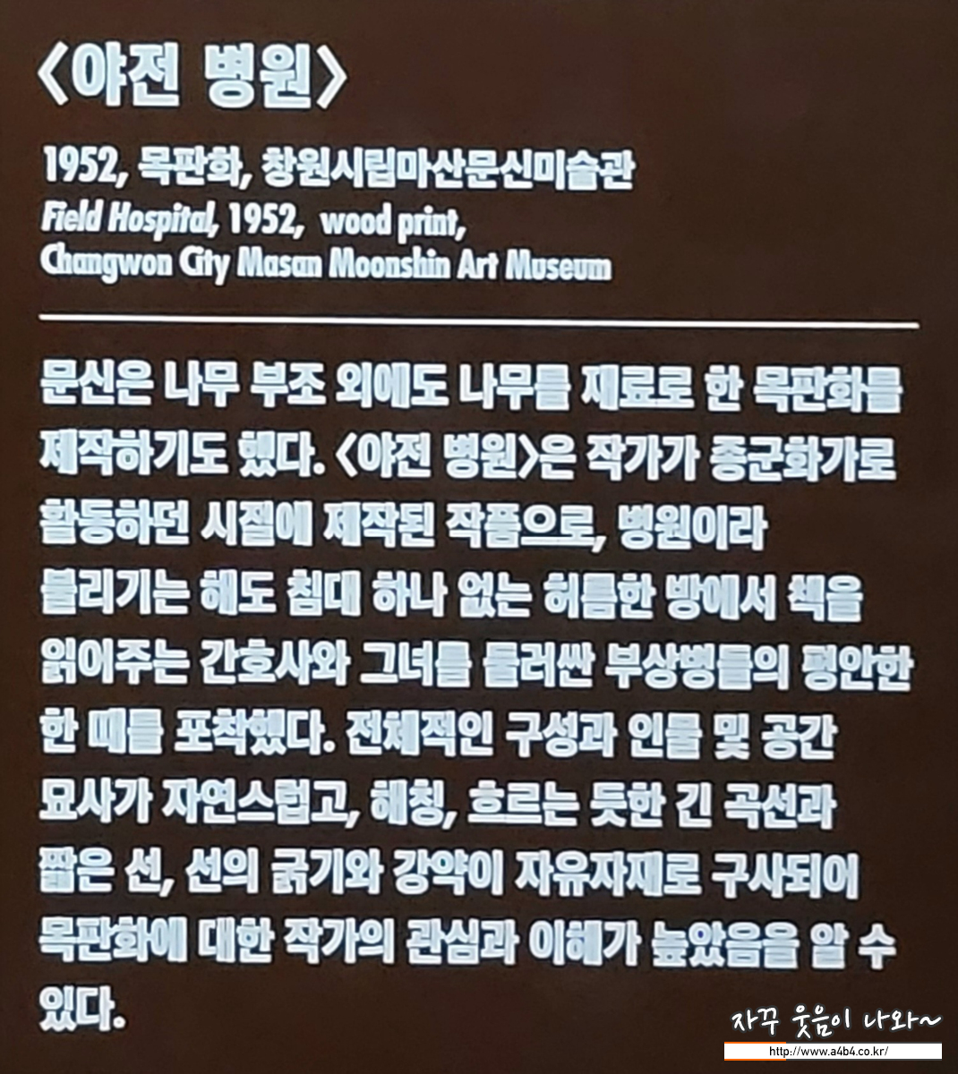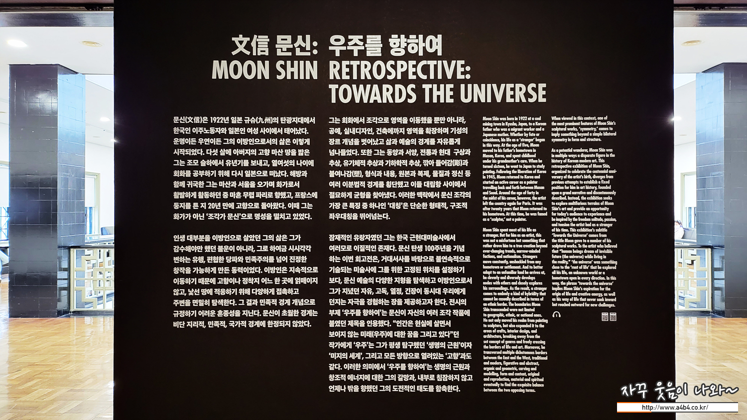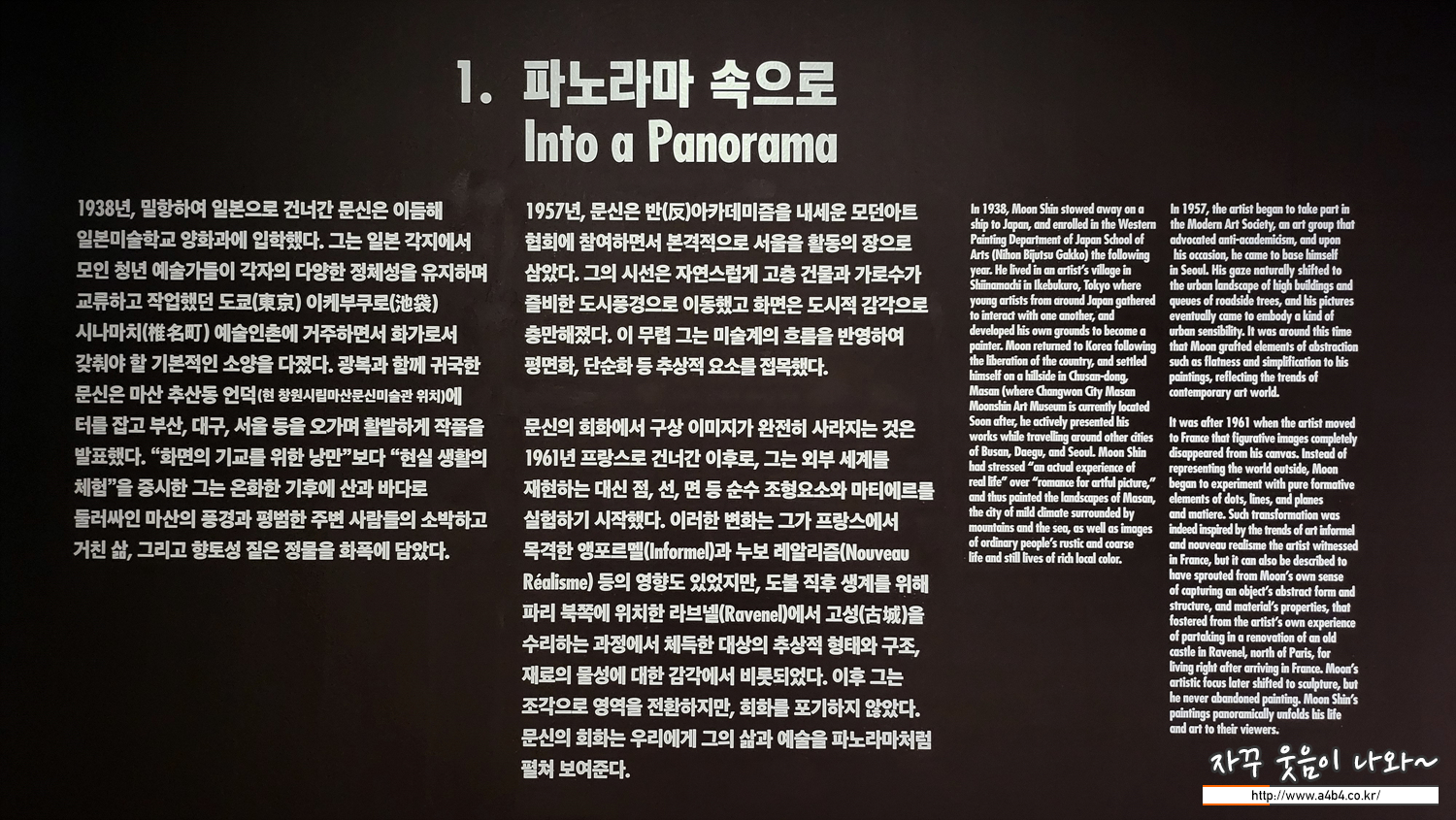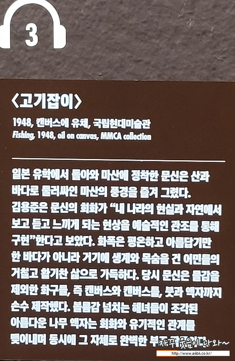 이번 덕수궁 국립현대미술관에서 열리고 있는 문신 전시회 관람소요 시간은 최소 2시간 정도가 필요해 보입니다. 넓은 넓은 공간은 아니지만 상당히 많은 그의 작품들과 2분 전후의 24개의 오디오 가이드를 고려하면 충분한 여유를 가지고 관람하시는 것을 추천드립니다.