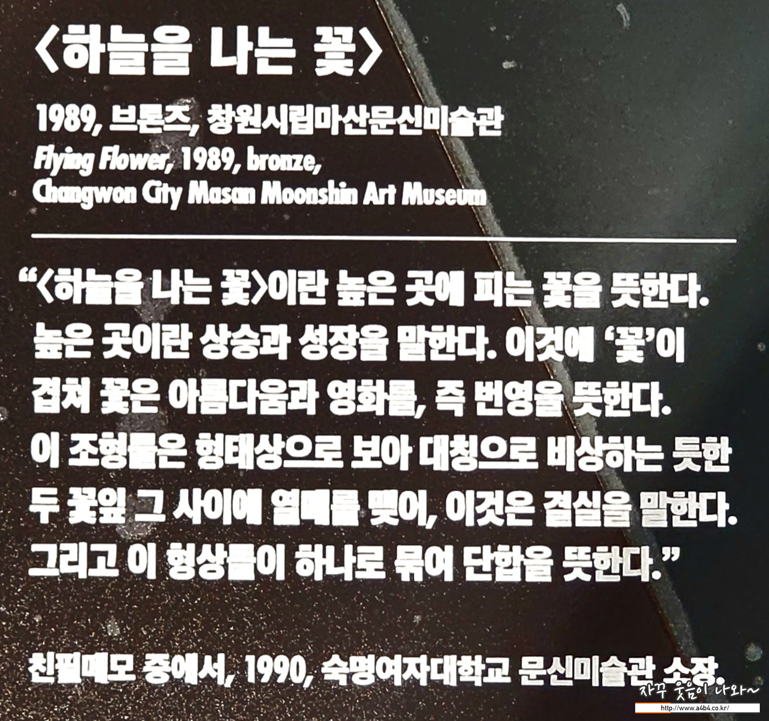 이 작품은 1989년, 문신이 프랑스에서 귀국한 뒤 제작한 것으로서, 영구 귀국 후 그의 작품에서 두드러지기 시작한 특징을 보여줍니다.