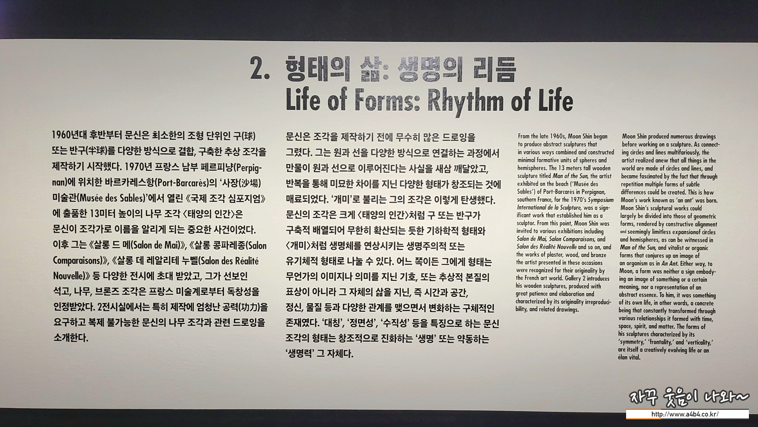 이번 조각가 문신 전시회는 덕수궁 국립현대미술관 1~4관에서 전시하고 있습니다. 참고로 2층이 1, 2관 1층이 3, 4관으로 구성되어 있으니, 먼저 2층으로 올라가셔서 관람시작 하세요.