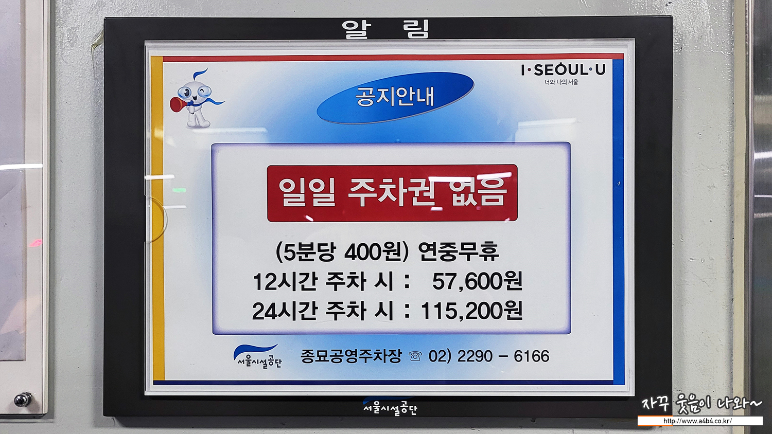 제가 선호하고 추천하는 곳은 바로 종묘공영주차장입니다. 광장시장 노상 주차장보다는 약간의 거리가 있지만, 항상 자리확보가 가능하고 지하에 있어 차량을 안전하게 관리할 수 있는 장점이 큰 곳입니다.