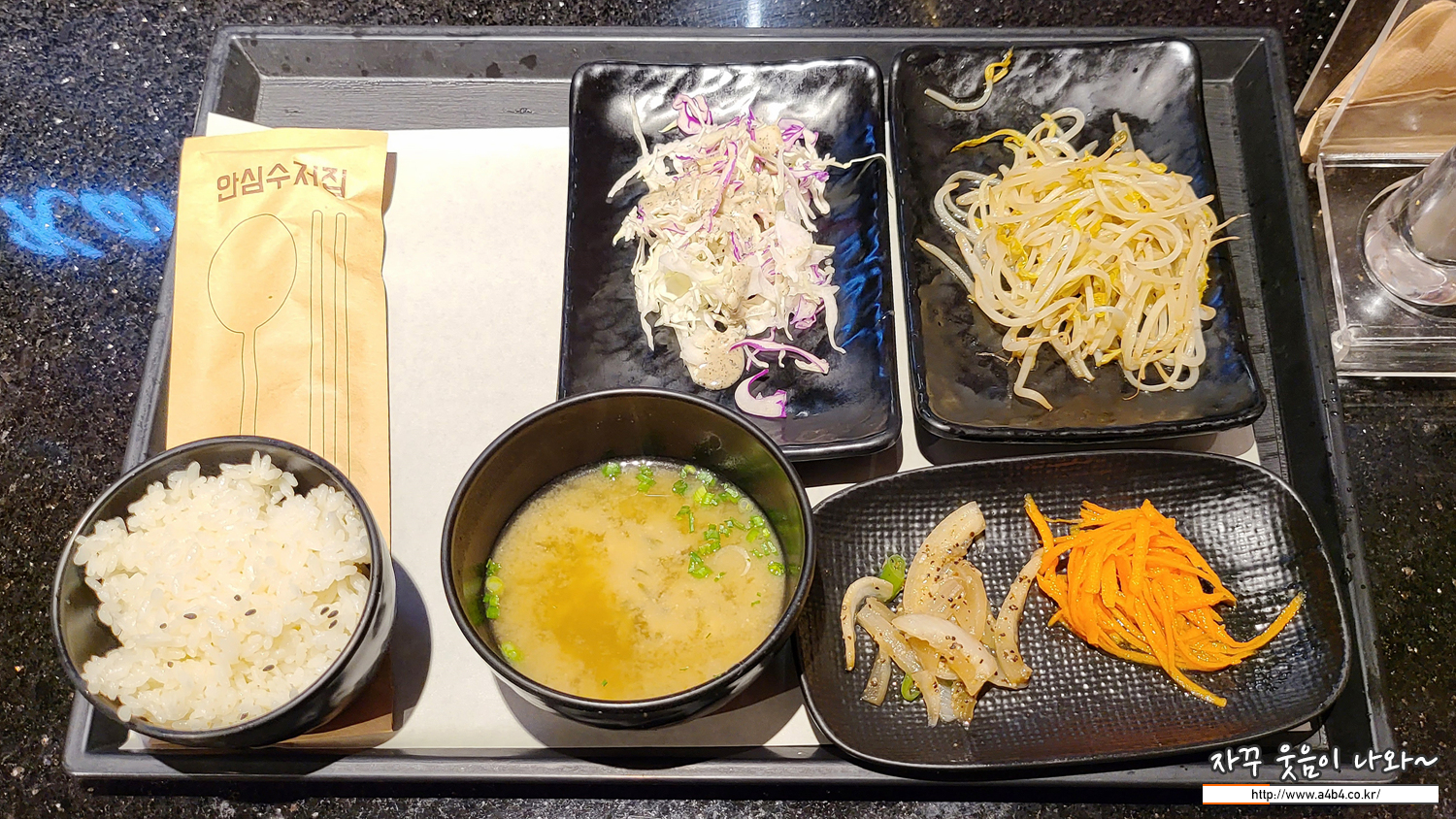 요리가 되는 중간에 각자 기본 반찬과 밥, 된장미역국이 서빙됩니다. 식전에 샐러드나 숙주볶음을 먹으면서 허기를 달래는... 그리고 잠시 후 조리된 철판볶음이 서빙됩니다.