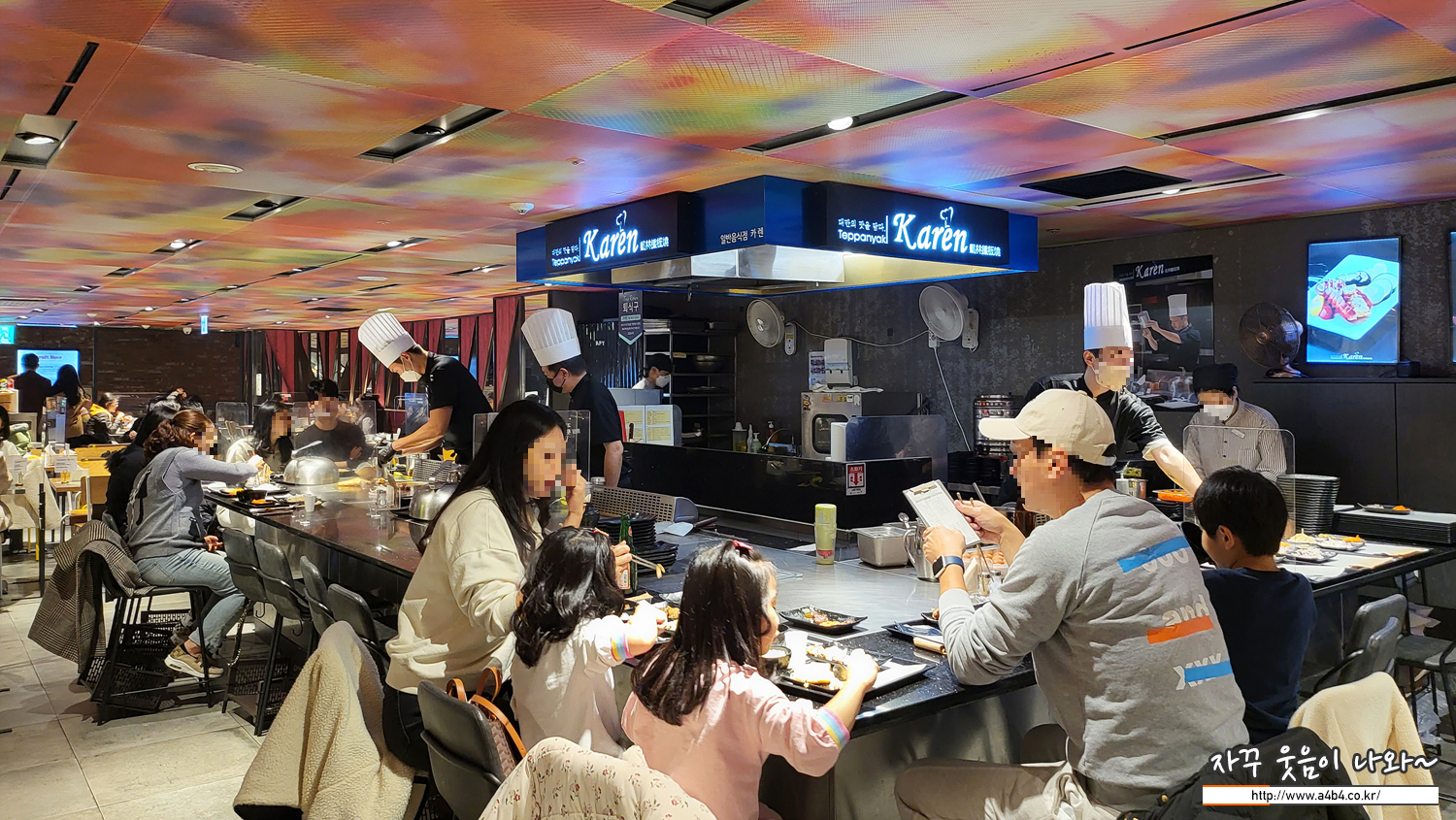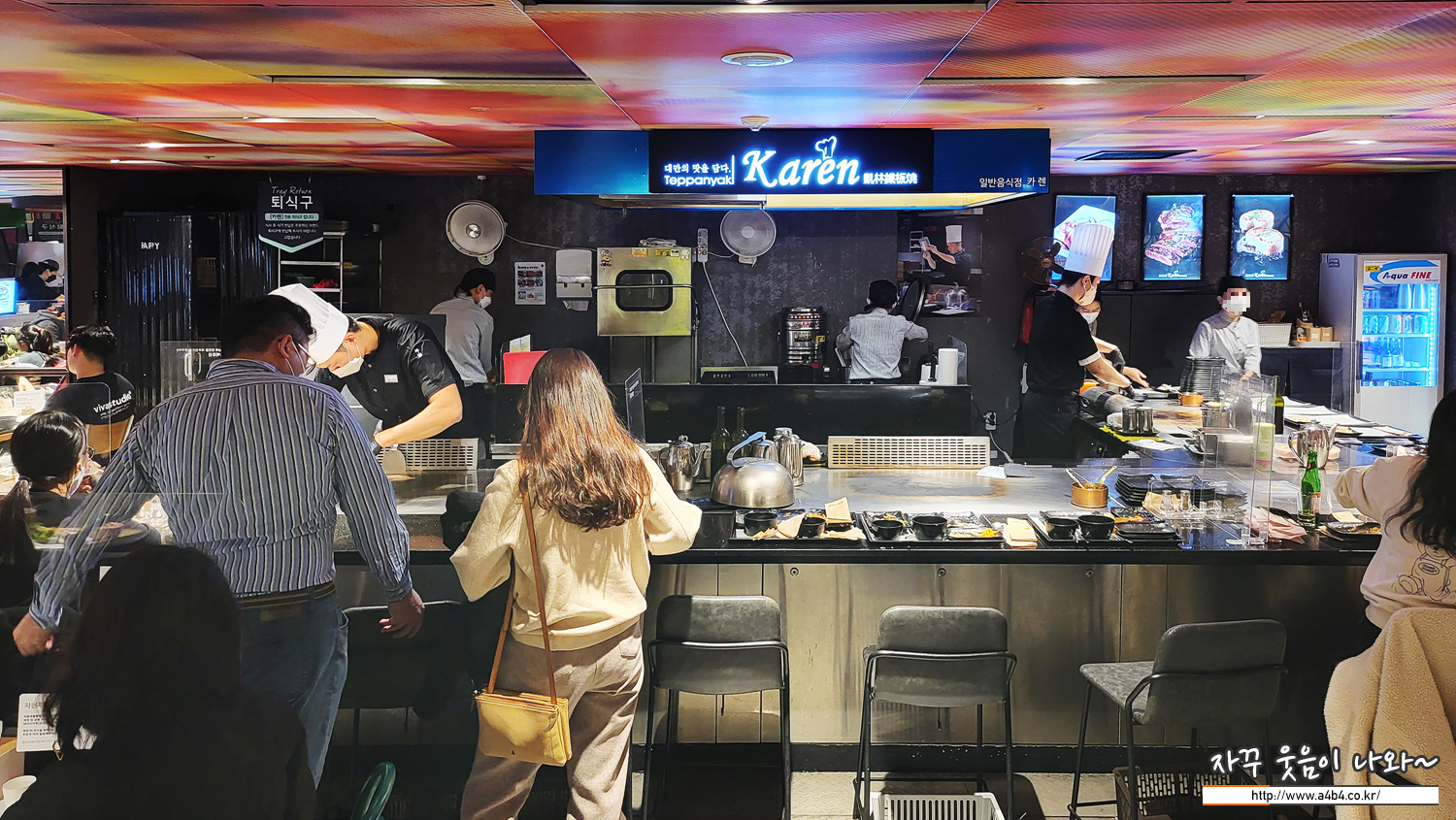 운 좋게 철판앞에 자리를 잡았습니다. 카렌 잠실점의 경우 롯대백화점 1층 푸드코트 옆에 위치한 '다이닝펍 카페' 구역에 위치해 있습니다. 자리가 없으면 조리하는 곳 뒷부분에 일반 테이블도 준비되어 있습니다.