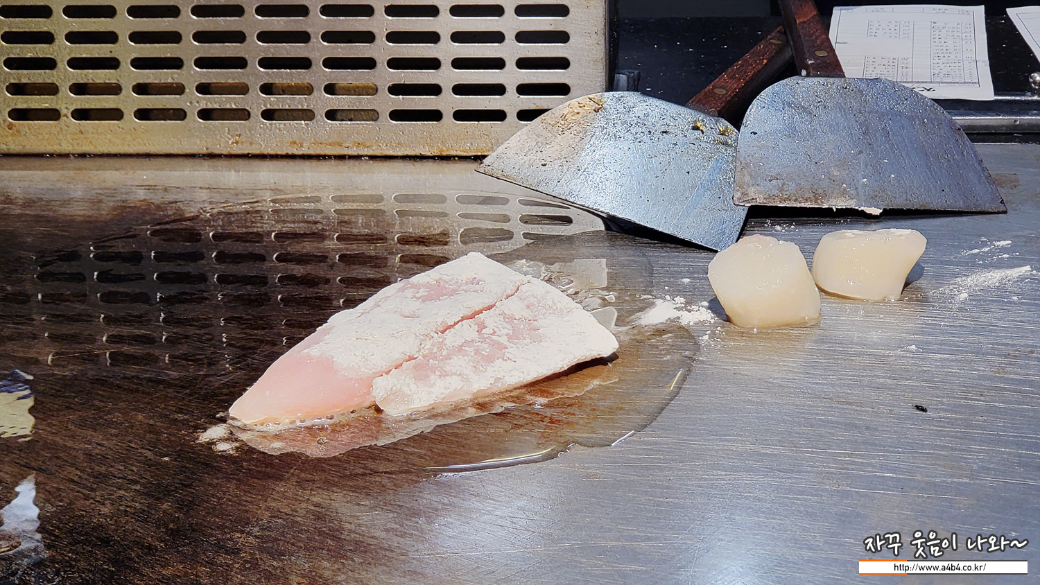 기름 위에서 흰살생선과 관자 철판요리가 진행되고.
