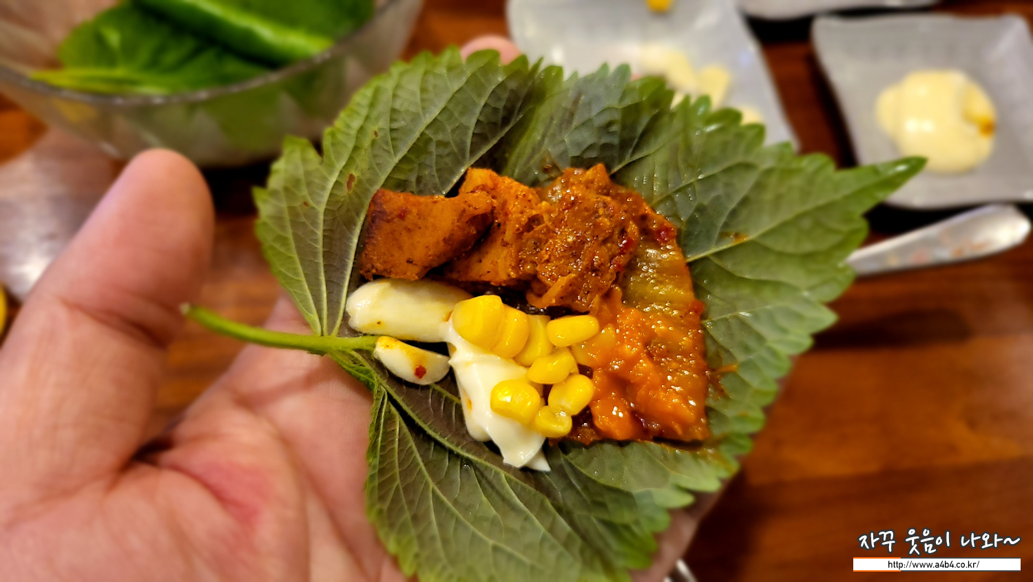 깻잎에, 옥수수, 쌈장, 마늘, 마요네즈를 다 넣고 쌈으로 먹는 방법이 있는데요. 묘한 맛을 보이네요. 이 조합이 나오네요. 짠맛이 조금 적어지네요.