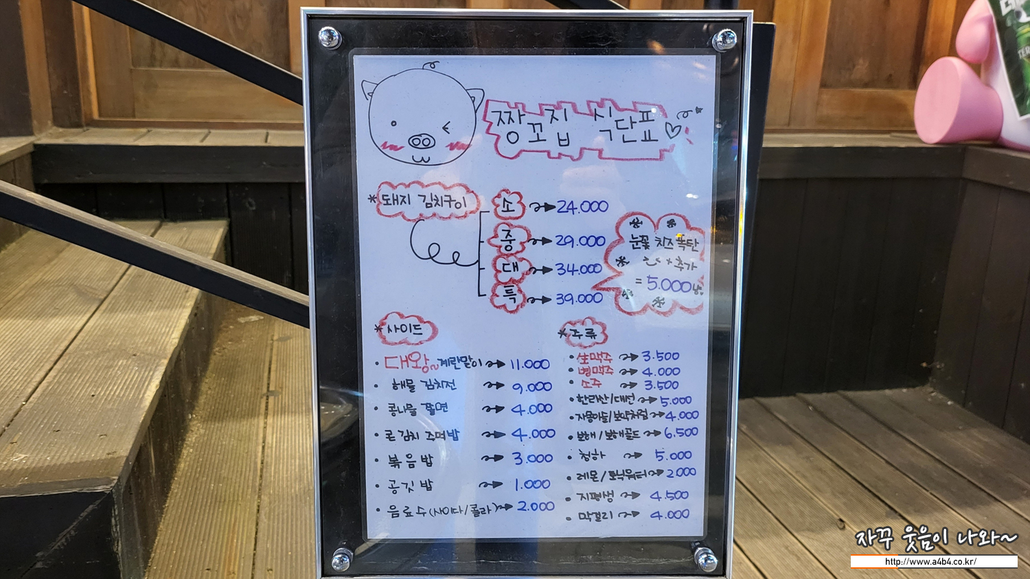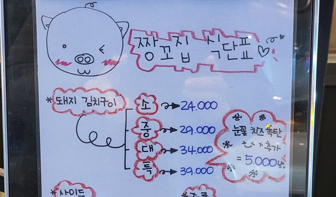 잠실새내역 맛집 짱꼬집 메인 메뉴는 '돼지 김치구이' 입니다. 이외에 사이드 메뉴로 대왕 계란말이, 콩나물쫄면, 해물김치전, 김치 주먹밥등이 있습니다. 짱꼬집 가격은 전반적으로 무난한 가격이네요. 잠실새내 가성비 좋은 맛집이라고 할까요.
