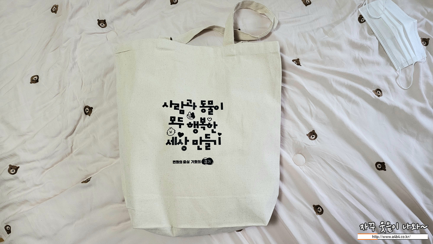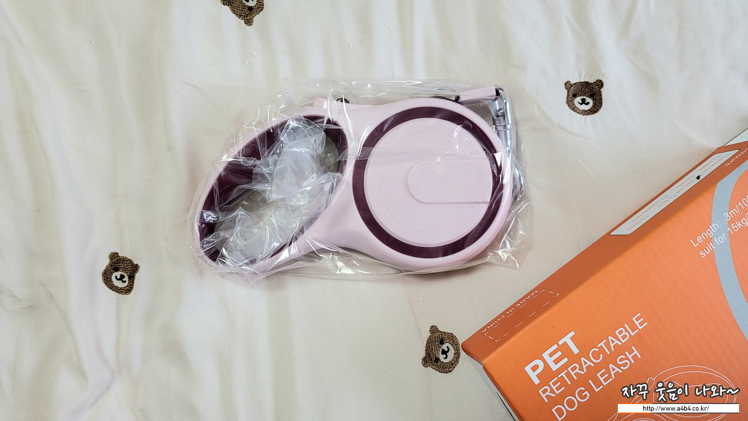 휴대용 배변봉투와 강아지 디자인의 휴대용 장바구니, 목줄도 들어 있습니다.