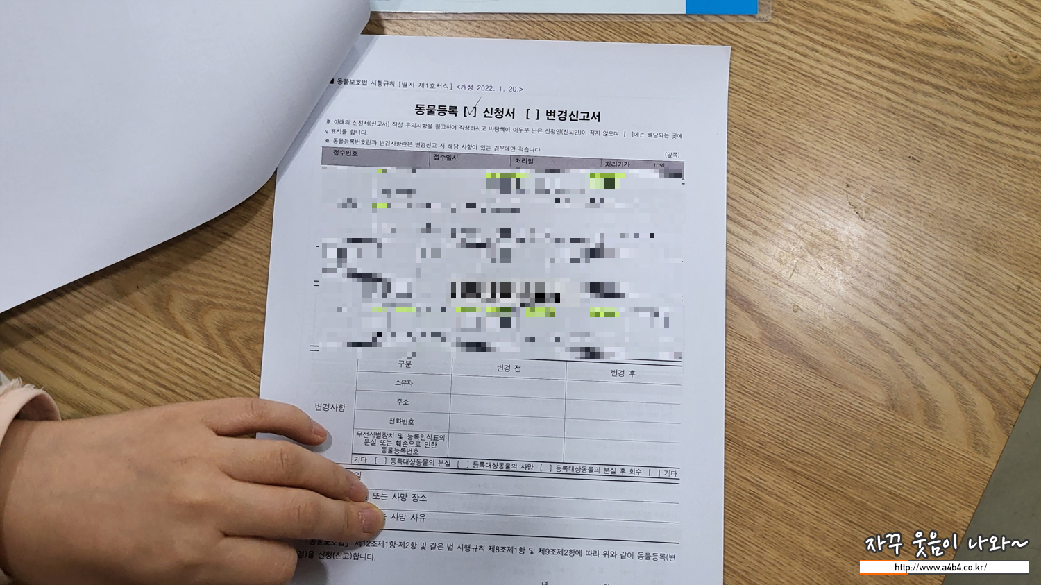 유기견 입양을 위한 서류작성이 진행됩니다. '입양확인서'와 '동물등록 신청서'를 작성합니다. 기본적으로 공공기관에서 진행하는 유기견 입양은 '무료분양'으로 별도 비용을 지불하지 않습니다.